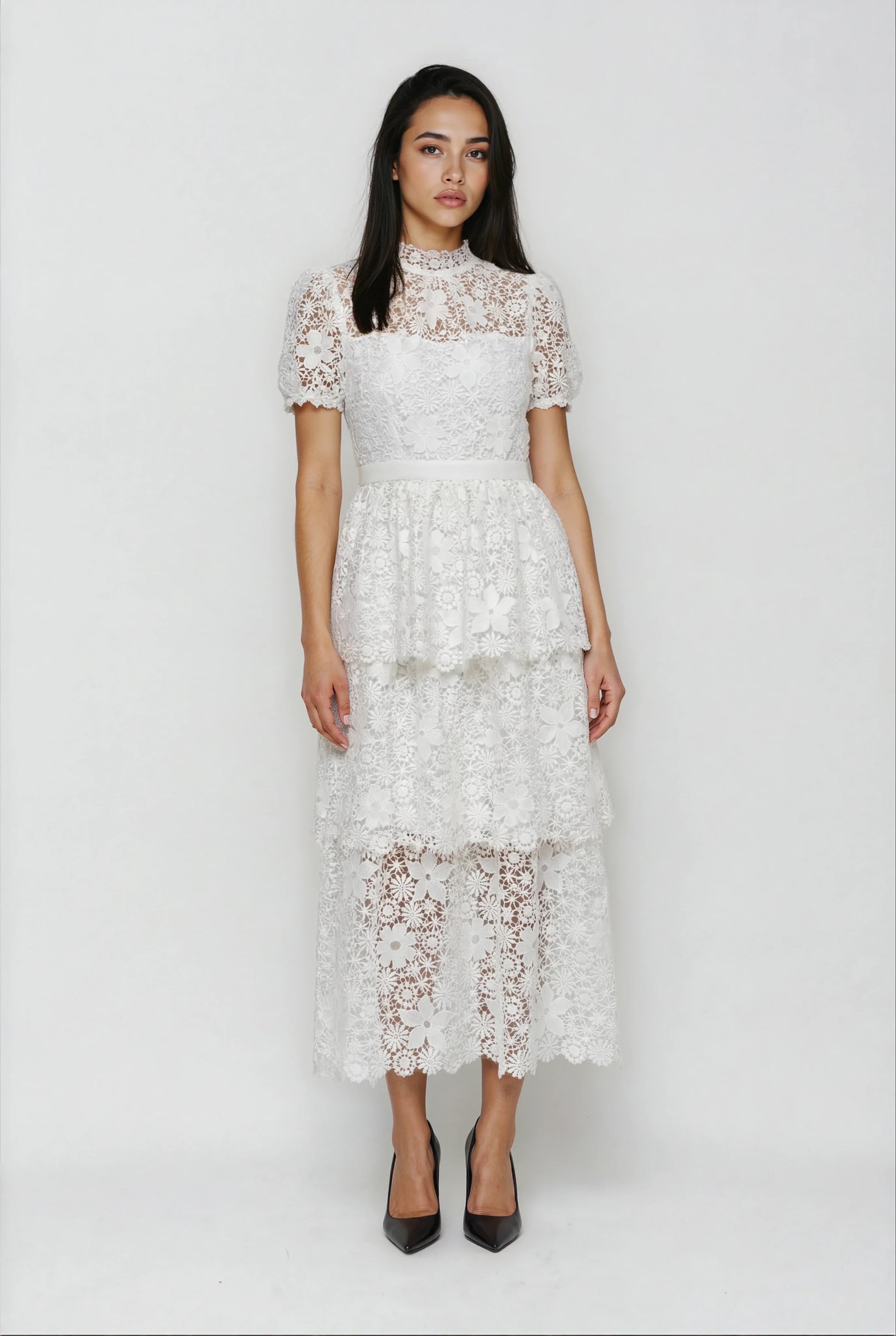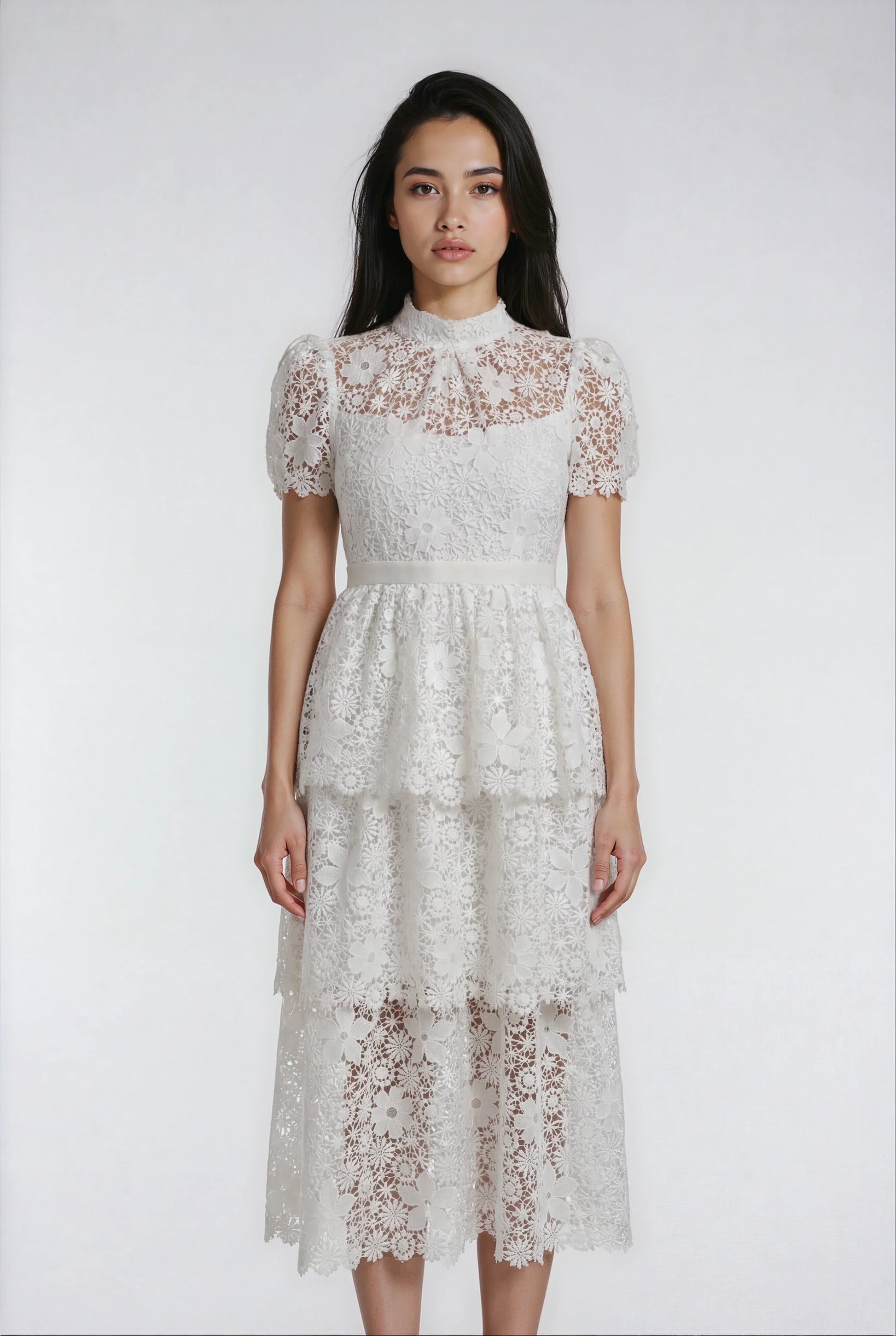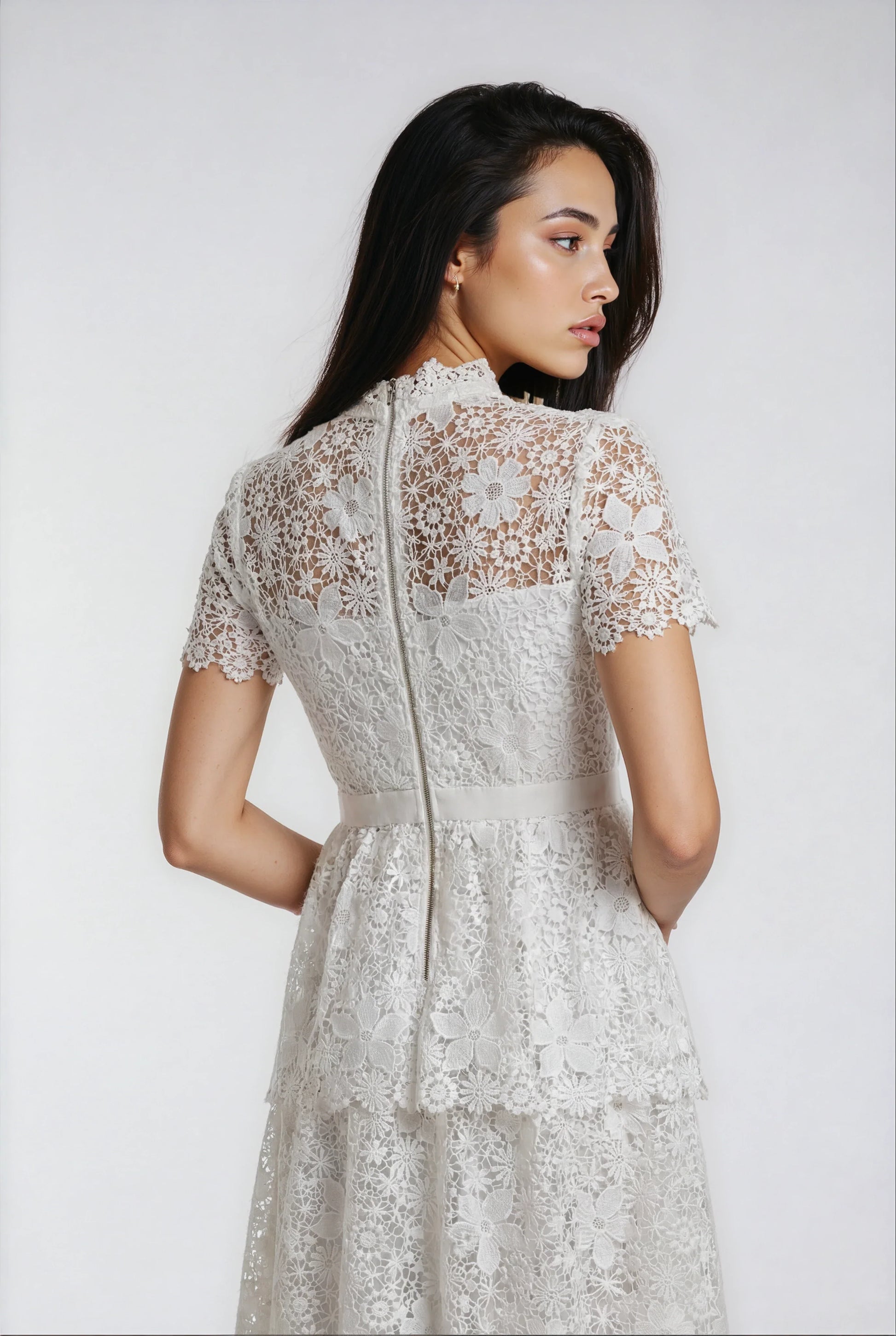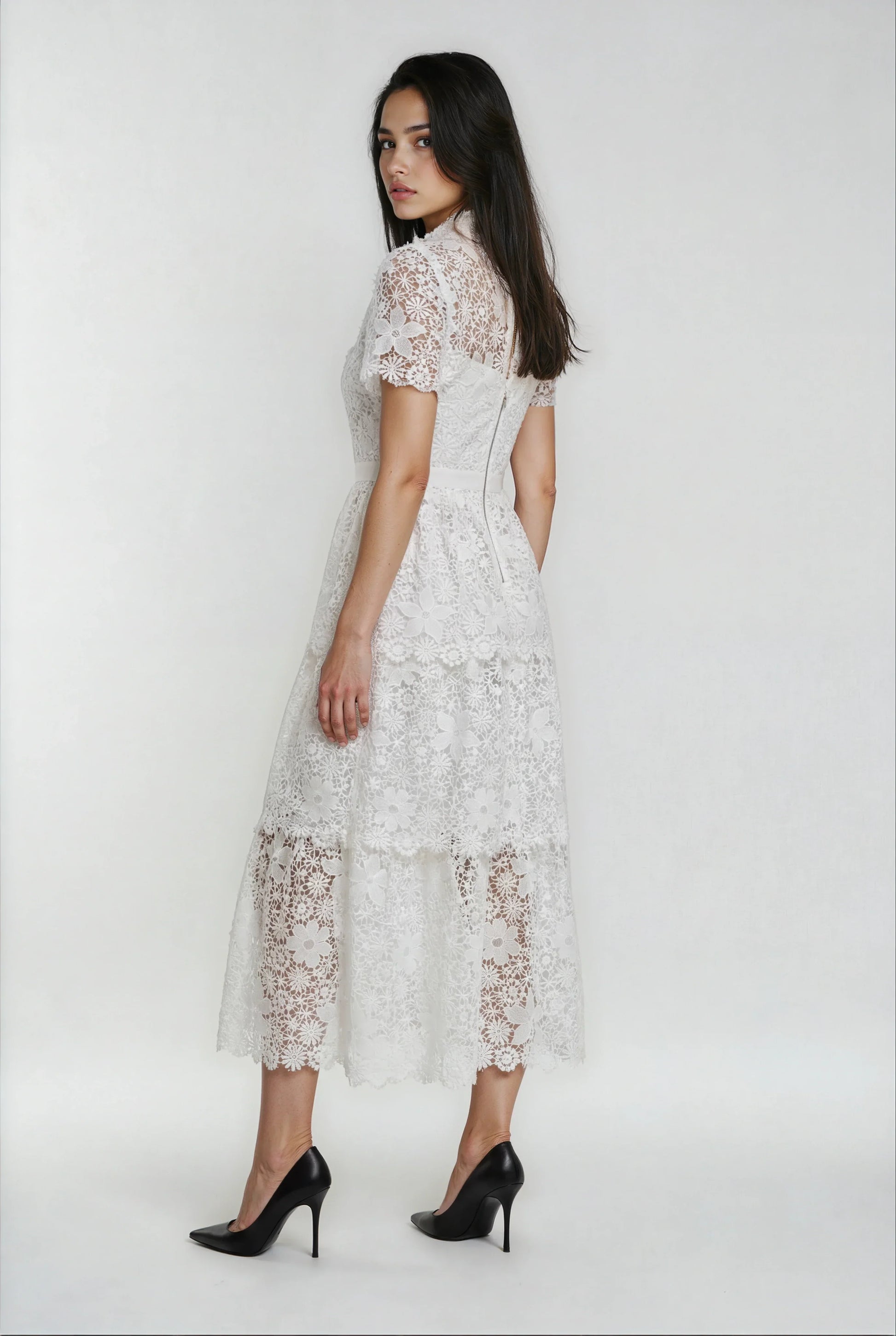 Bu elbise, ağır ve özenli dantel süslemeleri ile saf beyaz rengi zarif bir uyumda buluşturuyor. Asimetrik yaka detayı ve yüksek bel tasarımıyla şık ve modern bir görünüm sağlar. Arkadaki fermuar ile kolay giyilip çıkarılırken, iç astarı konforu artırır. Dantel detaylarındaki hafif rastgelelik her elbiseye özgün ve sanatsal bir karakter katar.