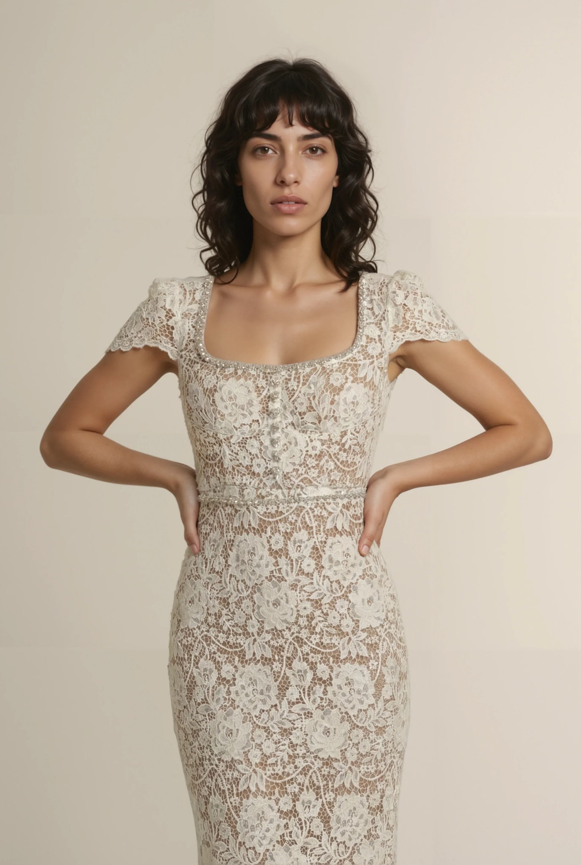 Doğal zarafeti ve özel tasarımı aynı anda deneyimlemek isteyenler için tasarlandı. Suda çözünebilir dantel patchwork detayları, iç astarı ve şık ortadan fermuarıyla dikkat çeken bu bej/yeşil elbise, benzersiz bir görünüm sunar. Kemer detayı ve yüksek bel tasarımıyla vücut hatlarınızı zarifçe vurgular, özel günleriniz için unutulmaz ve doğadan esinlenmiş bir seçim olacaktır.