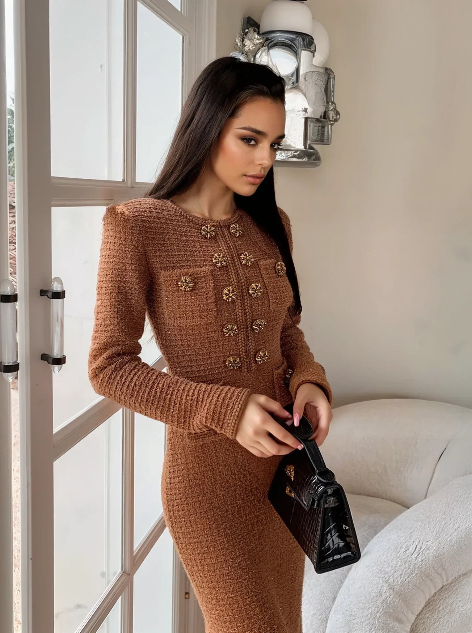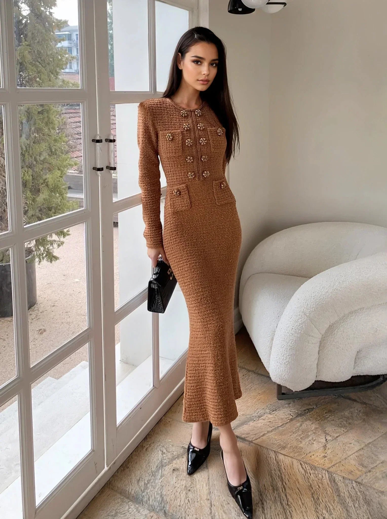 Koyu kahverenginin sıcak tonları ve ışıltılı payet detaylarıyla göz alan bu yün örgü elbise, şık bir gece görünümü vaat ediyor. Yüksek bel tasarımı ve esnek yapısıyla vücudu saran bir uyum sunarken, düğmeli pat ve kanca detayıyla zarif bir tamamlayıcı. Cepleri pratik bir dokunuş katıyor.