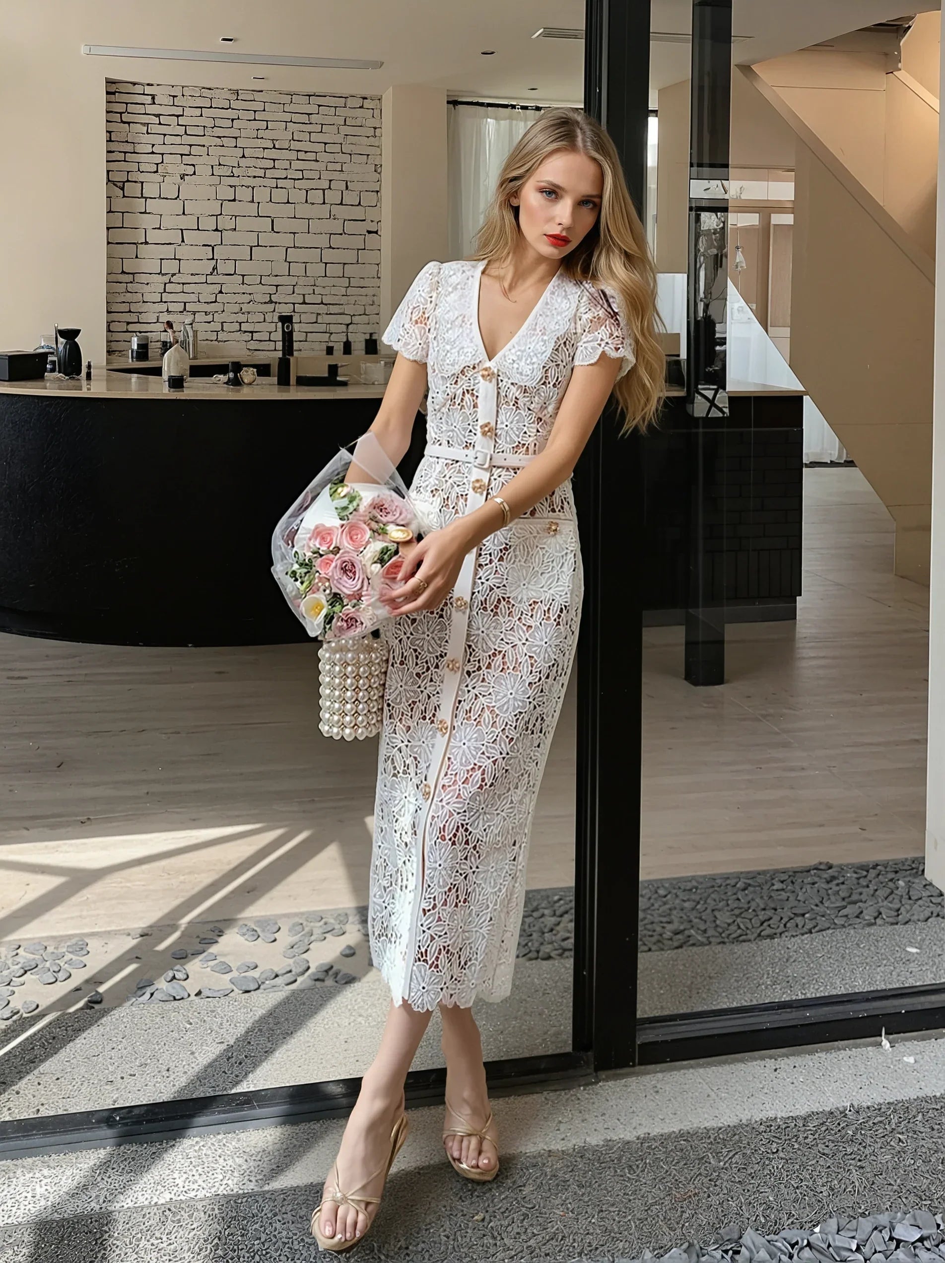 Bu krem dantel elbise, zarif dantel detayları ve şık gizli düğmeli patlet tasarımıyla göz alıyor. İç astarı, bel kemeri ve kullanışlı cepleriyle hem konforlu hem de pratik bir kullanım sunar. Yüksek bel tasarımıyla vücudu saran bu elbise, özel davetler ve romantik gece etkinlikleri için şık ve zarif bir seçim olacaktır.