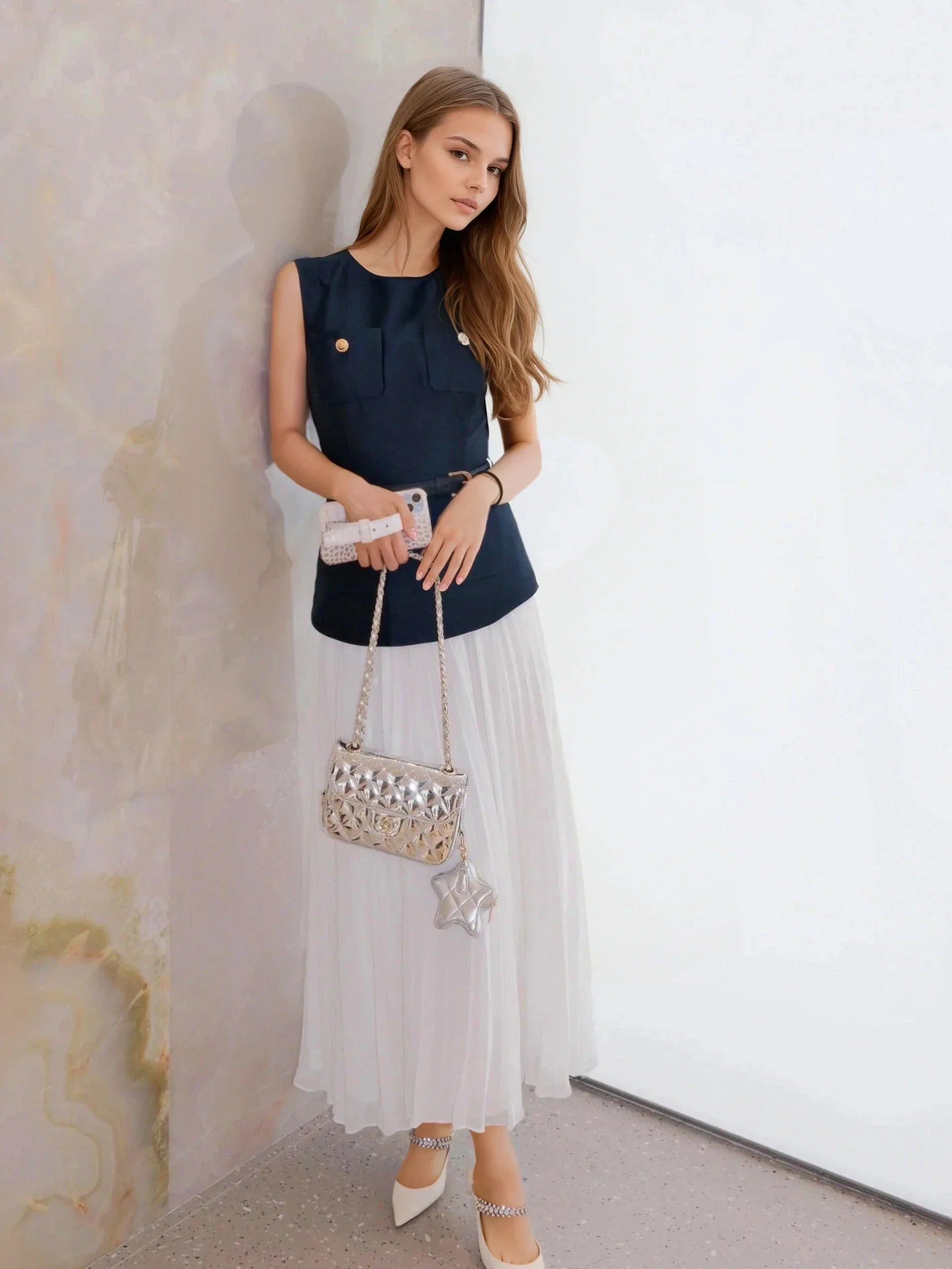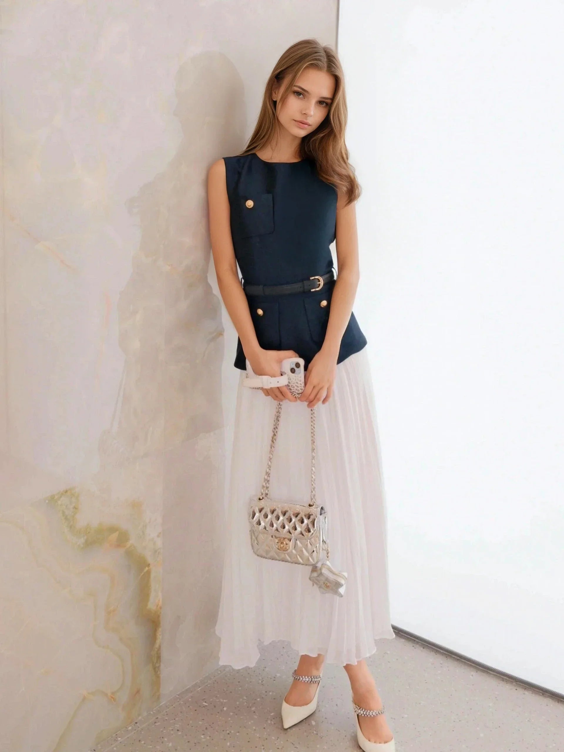 Zarif mavi ve beyaz kombinasyonu ve şifon kenar detayıyla dikkat çeken bu elbise, uzun model seçeneğiyle farklı tarzlara hitap ediyor. Yüksek bel tasarımı ve göğüs desteğiyle şık bir görünüm sunarken, kemer detayı, cepleri, arka fermuarı ve astarlı yapısı ile konforlu bir giyim deneyimi sağlıyor.