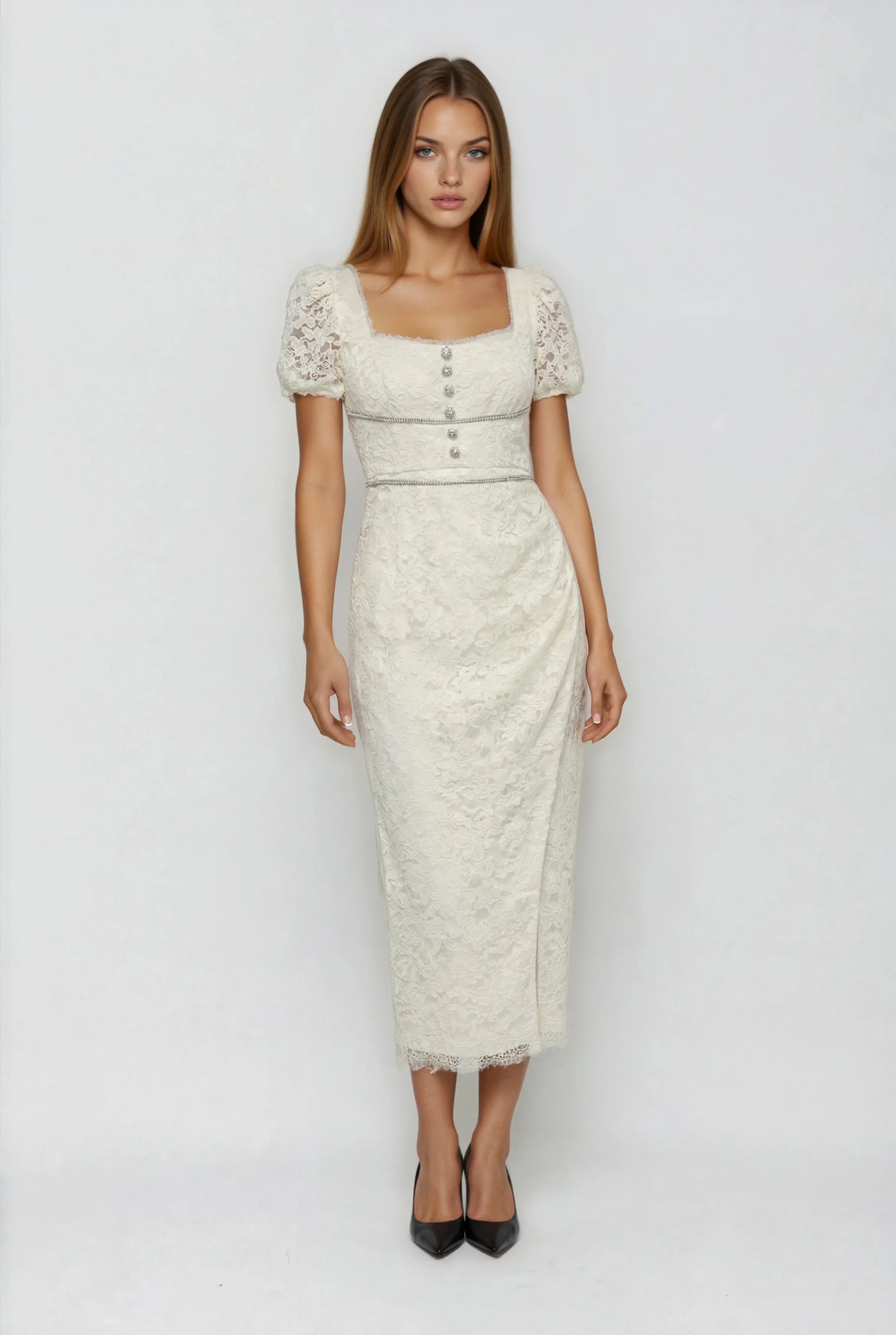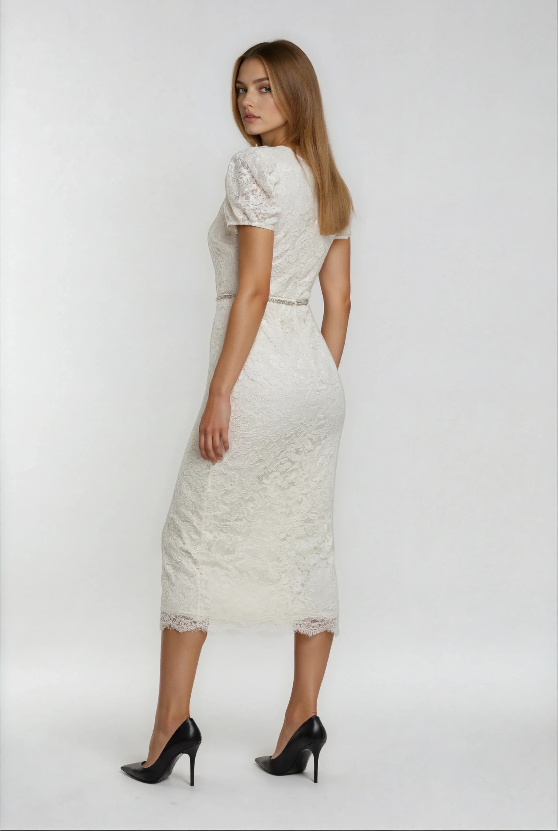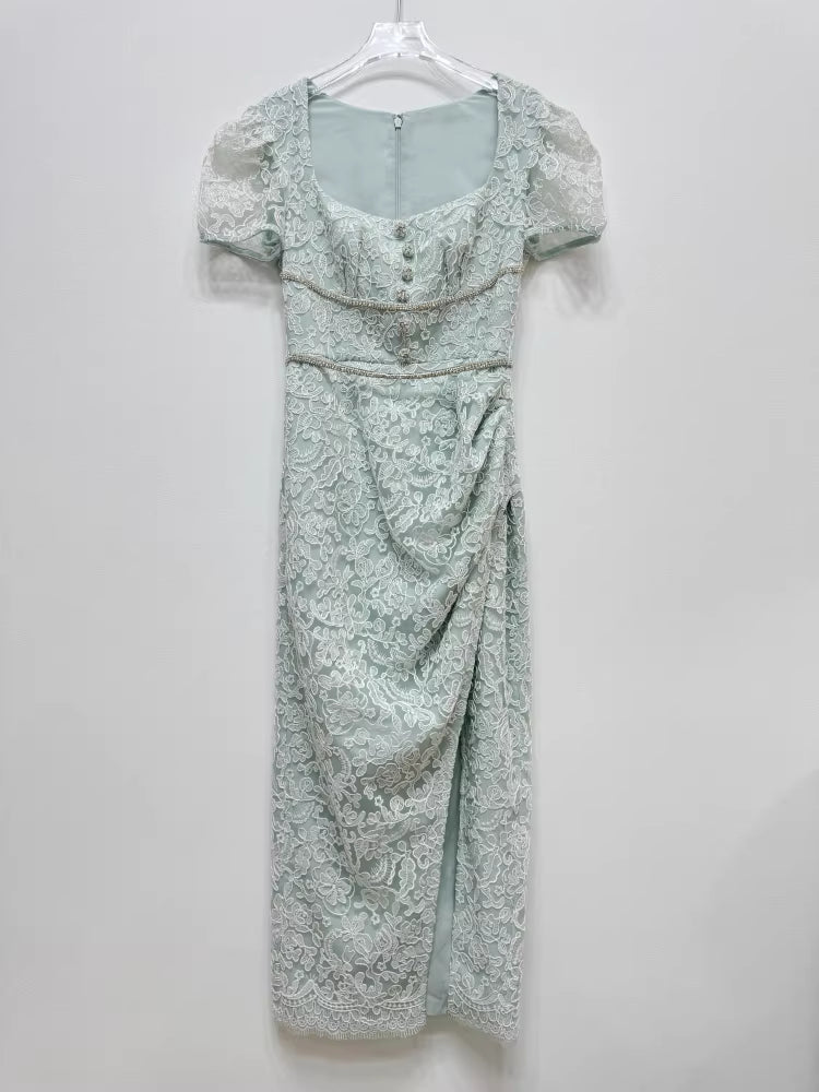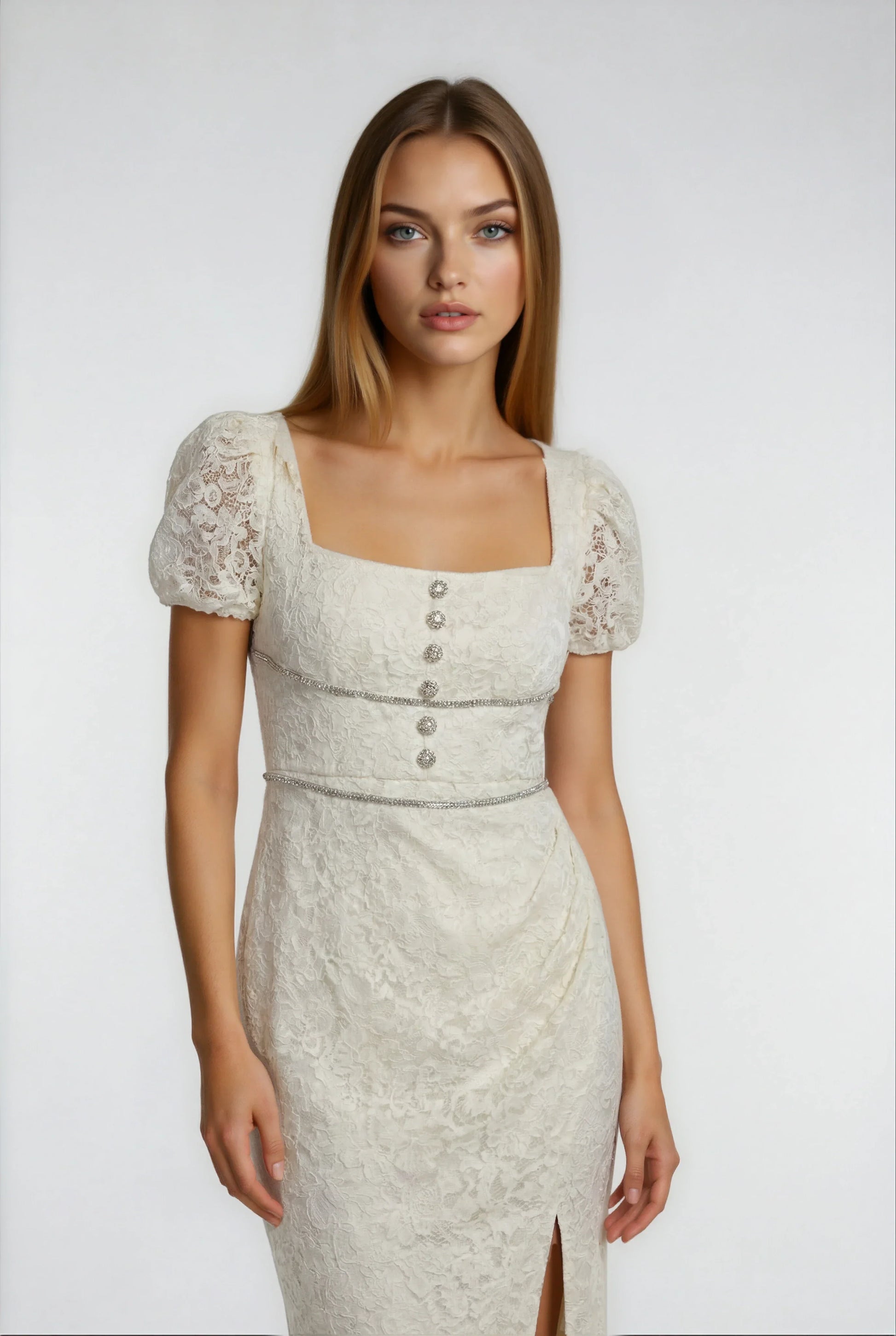 Bu uzun elbise, zarif dantel kenar detaylarını krem ve yeşil renk seçenekleriyle birleştiriyor. Yüksek bel tasarımı ve vücudu saran kesimiyle şık ve uzun bir görünüm sunar. Öndeki fermuar ve yanında verilen kemerle hem kolay giyim hem de kişiselleştirilebilir bir stil imkanı sağlar. Astarlı iç yapısı konforu artırır. Önemli not: Astarlama işlemi resmi bir kurum tarafından belgelendirilmemiştir.