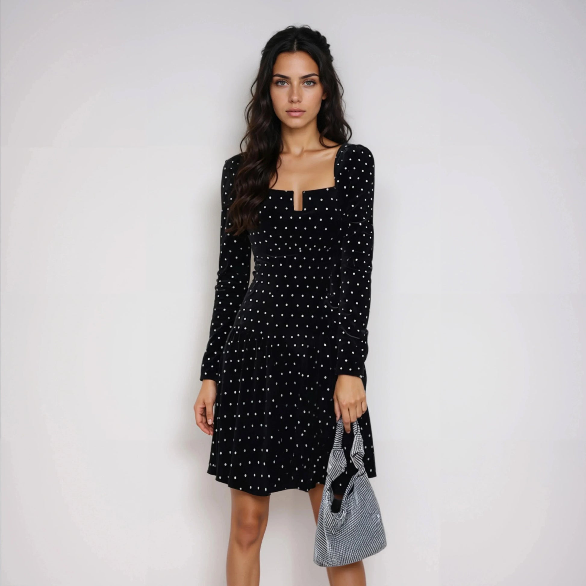 İhtişamı ve zarafeti aynı anda deneyimlemek isteyenler için tasarlandı. İpek kadife kumaşı ve sıcak taş (strass) süslemeleriyle göz alan bu siyah elbise, mükemmel bir görünüm sunar. İç astarı ve şık arkadan fermuarıyla konforlu bir kullanım sağlarken, düşük bel tasarımıyla modern ve şık bir görünüm oluşturur. Özel geceleriniz için unutulmaz bir seçim olacaktır.
