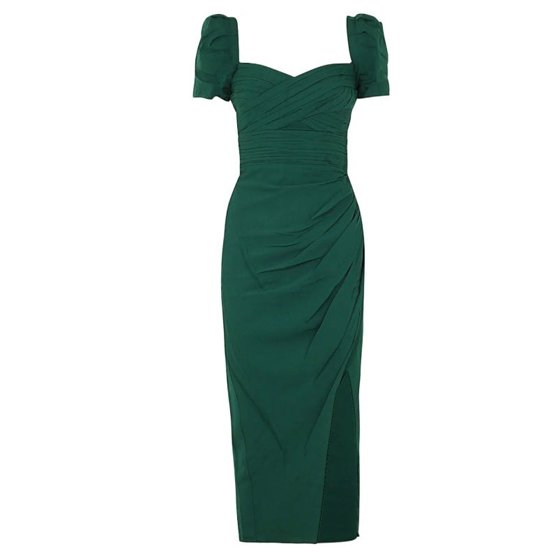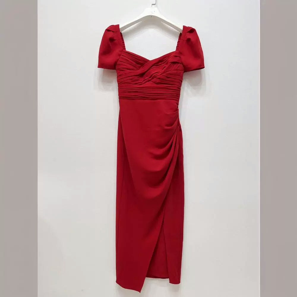 Bu şık elbise, polyester karışımı kumaşı ve arka fermuar detayıyla iki çarpıcı renkte sunuluyor: Zümrüt Yeşili ve Kırmızı. İç astarı konforlu bir giyim deneyimi sunarken, yüksek bel tasarımı ve dar kesimiyle vücudu saran zarif bir görünüm sağlar. Pilelerdeki doğal rastgelelik her elbiseye özel bir karakter katar. Özel davetler için göz alıcı ve şık bir seçimdir.