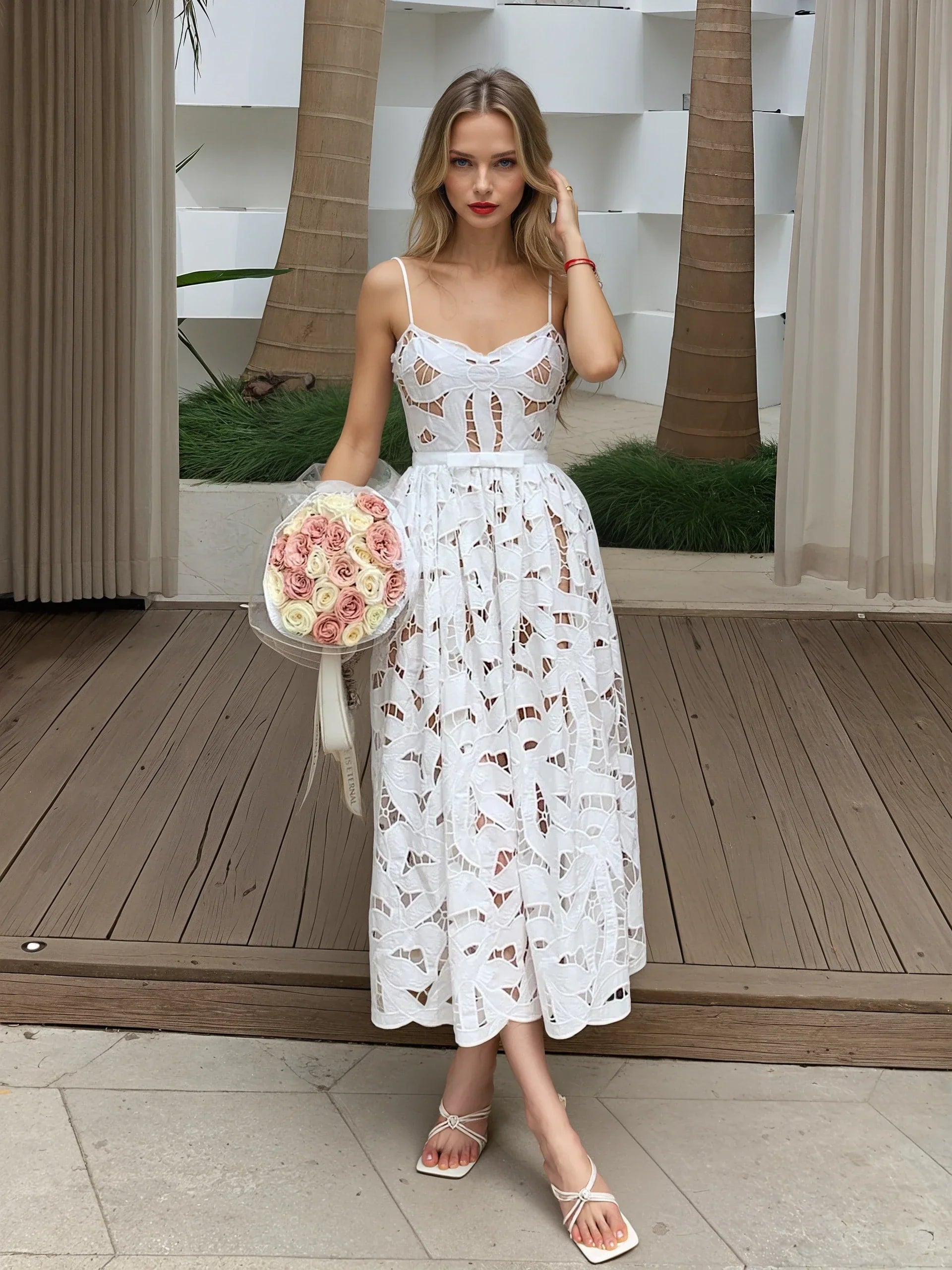 Canlı kırmızı veya saf beyaz renk seçenekleriyle dikkat çeken bu dantel elbise, hem enerjik hem de romantik bir tarz sunuyor. Yüksek bel tasarımı ve göğüs desteğiyle zarif bir görünüm vadeden model, askılı yapısı ile şıklığı tamamlıyor. Özel günler ve davetler için şık ve kadınsı bir seçim.