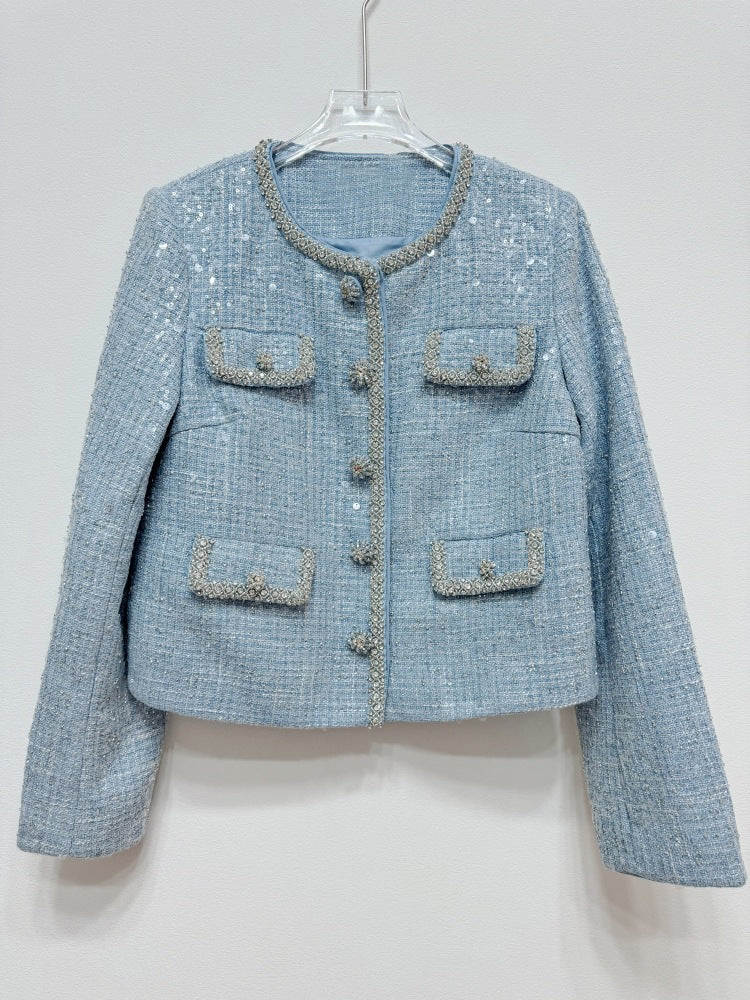 Sis mavisi rengi ve göz alıcı payetli tüvit kumaşıyla dikkat çeken bu ceket, şıklığı ve ışıltıyı bir arada sunuyor. Yüksek bel tasarımıyla şık bir görünüm vadeden model, gizli düğmeleri, astarlı yapısı ve kullanışlı cepleri ile hem zarif hem de işlevsel bir parça. Açık patlet tasarımı modern bir dokunuş katıyor.