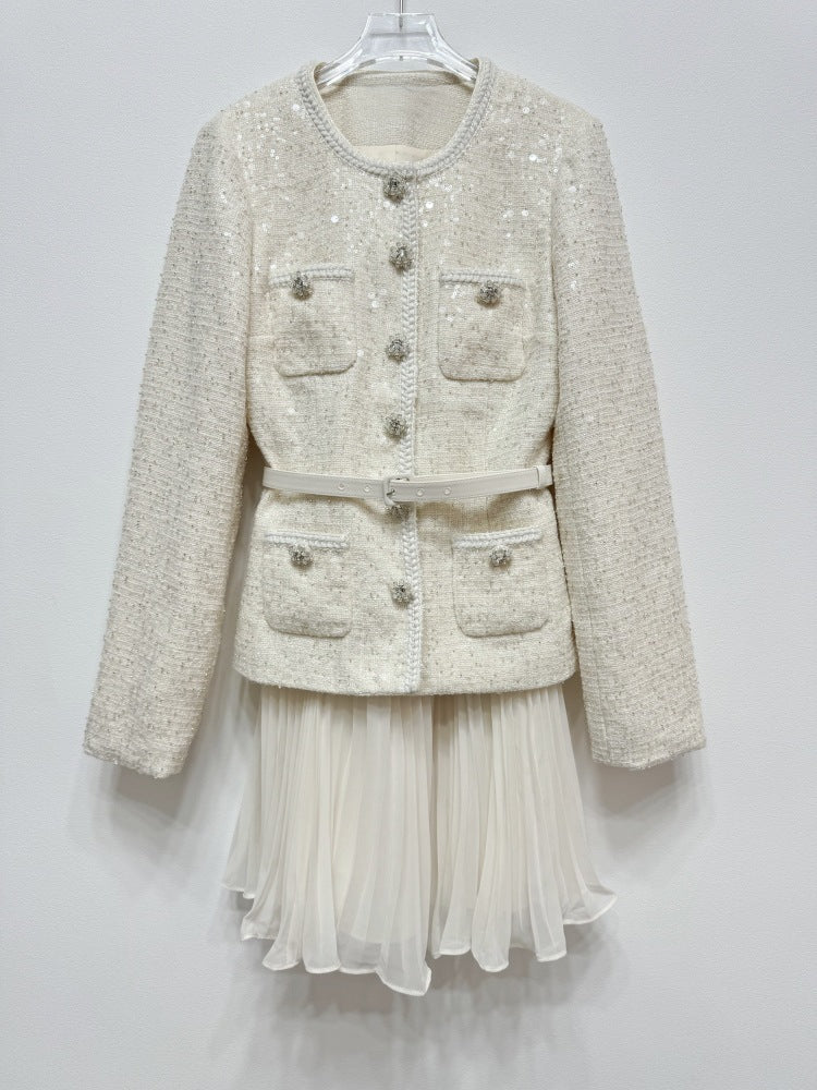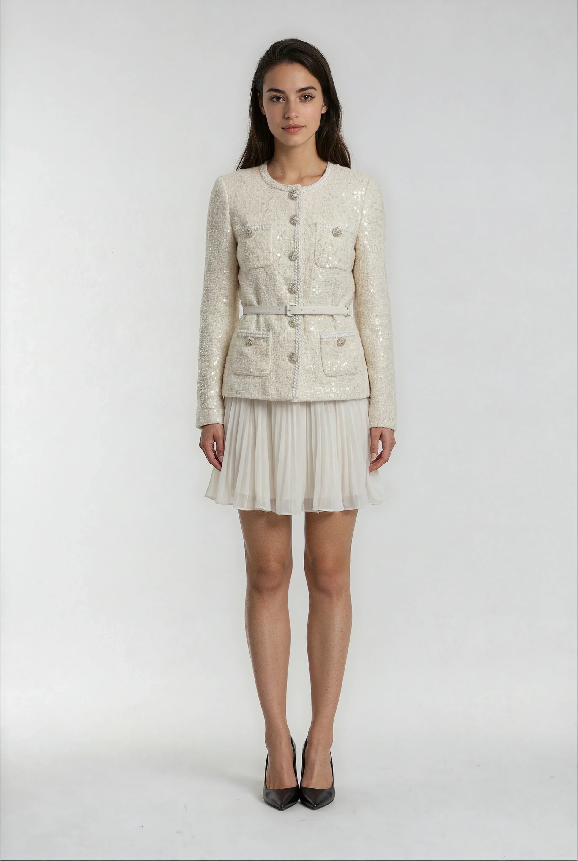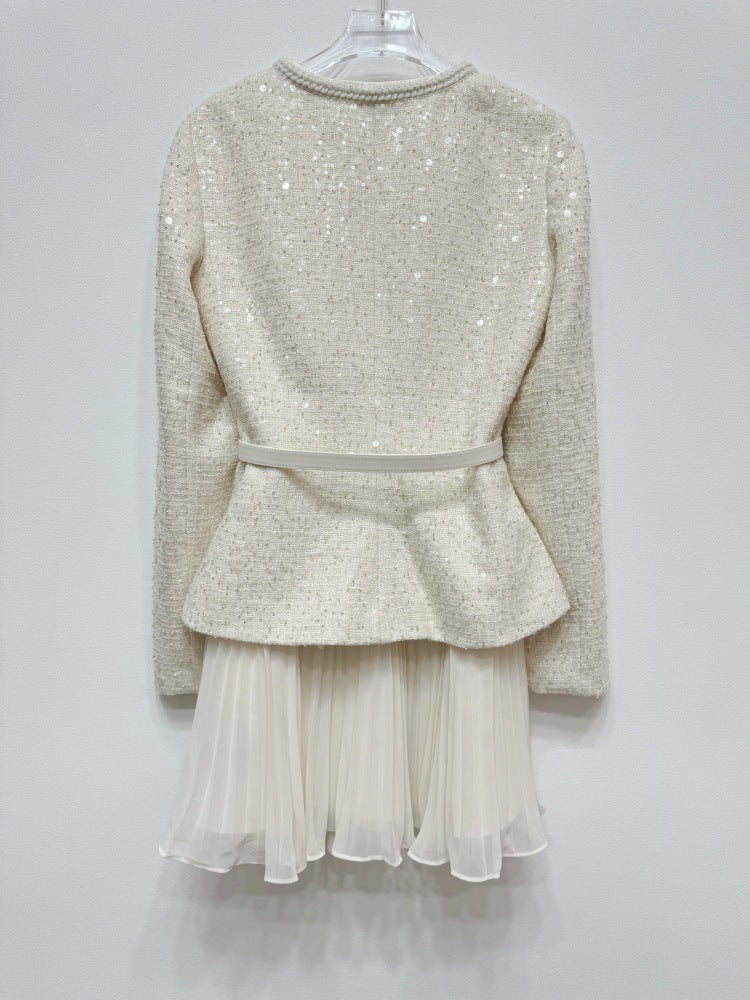 Zarif krem rengi ve ışıltılı payetli yün-şifon karışımı kumaşıyla dikkat çeken bu elbise, şık ve romantik bir tarz sunuyor. Yüksek bel tasarımı ve göğüs desteğiyle zarif bir görünüm vadeden model, çıtçıtlı kapanışı, kemer detayı ve astarlı cepleri ile tamamlanıyor. Etek ucundaki yan fermuar ve astar konforlu bir giyim deneyimi sağlar.