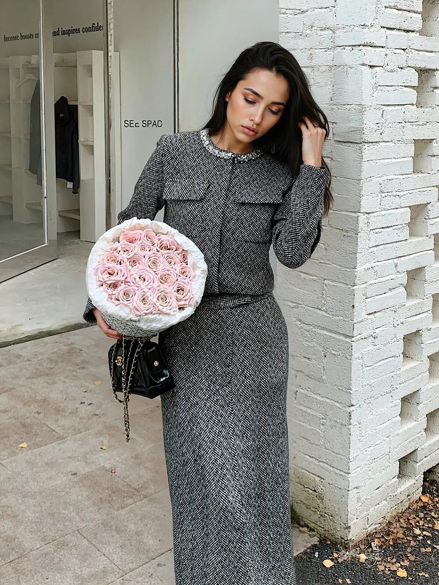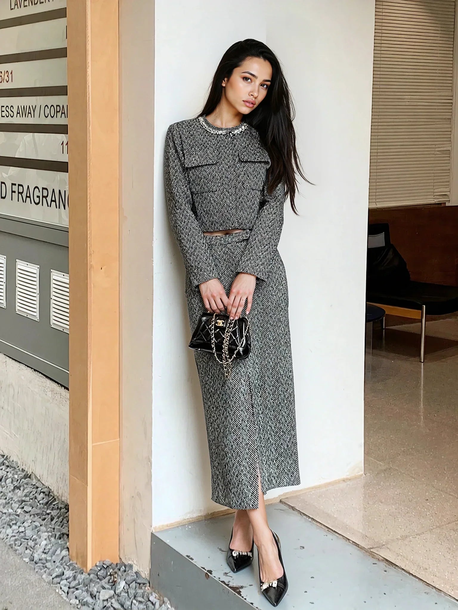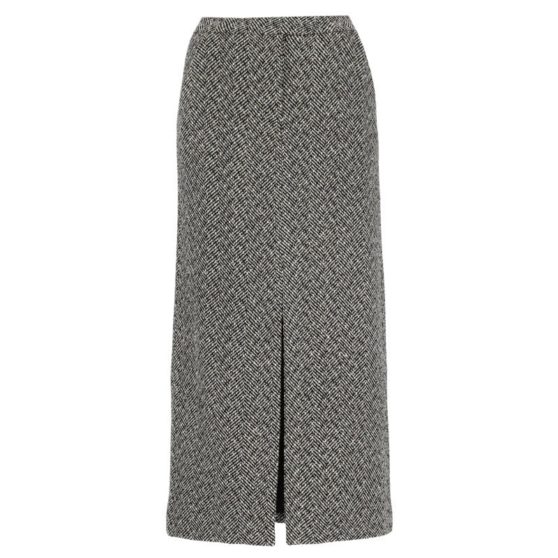 Klasik gri rengi ve şık tüvit kumaşıyla profesyonel ve günlük kombinlerin vazgeçilmezi olan bu uzun etek, yüksek bel tasarımıyla zarif bir görünüm sunuyor. Arka fermuarı ve iç astarı ile hem konforlu hem de şık bir giyim deneyimi sağlar. Üzerine farklı bluz ve ceketlerle kolayca kombinlenebilir, her anınıza uyum sağlar.
