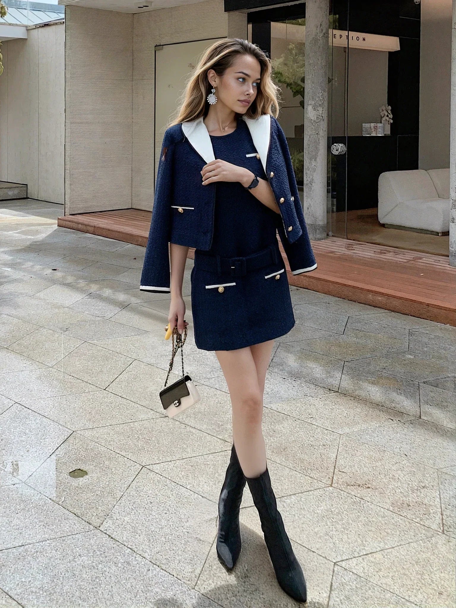 Koyu mavi rengi ve kalın dokuma kumaşıyla şıklığı yakalayan bu ceket, profesyonel ve özel kombinlerin vazgeçilmez parçası. Düğmeli ön kısmı, kullanışlı cepleri ve iç astarı ile hem şık hem de işlevsel bir tasarıma sahiptir. Üzerine farklı bluz ve eteklerle kolayca kombinlenebilir, her anınıza uyum sağlar. Üst kısım biraz bol kesimlidir.