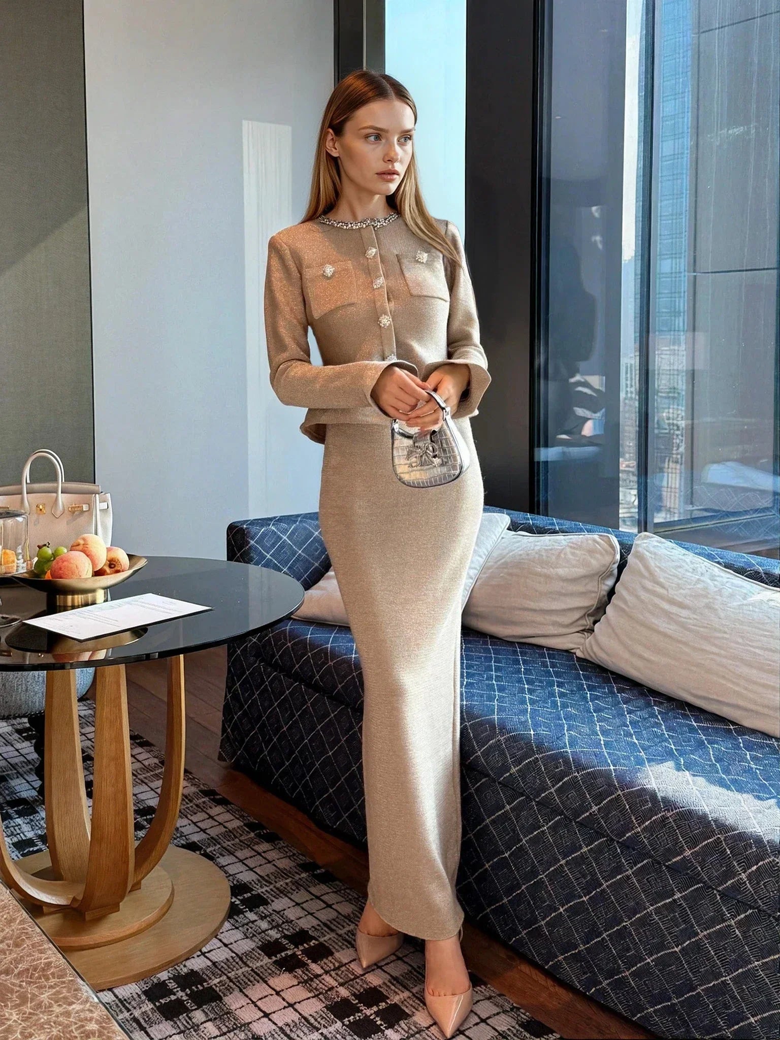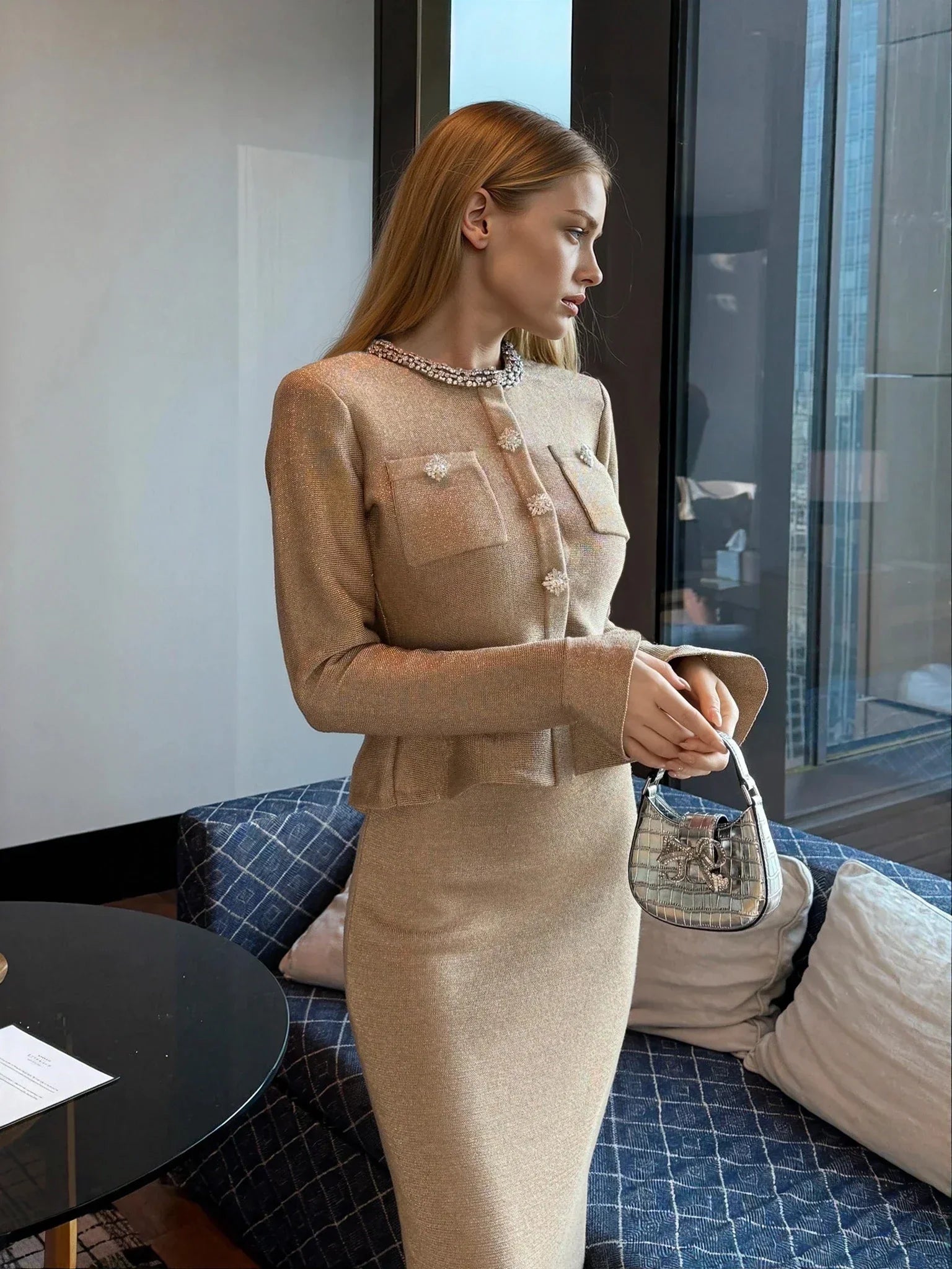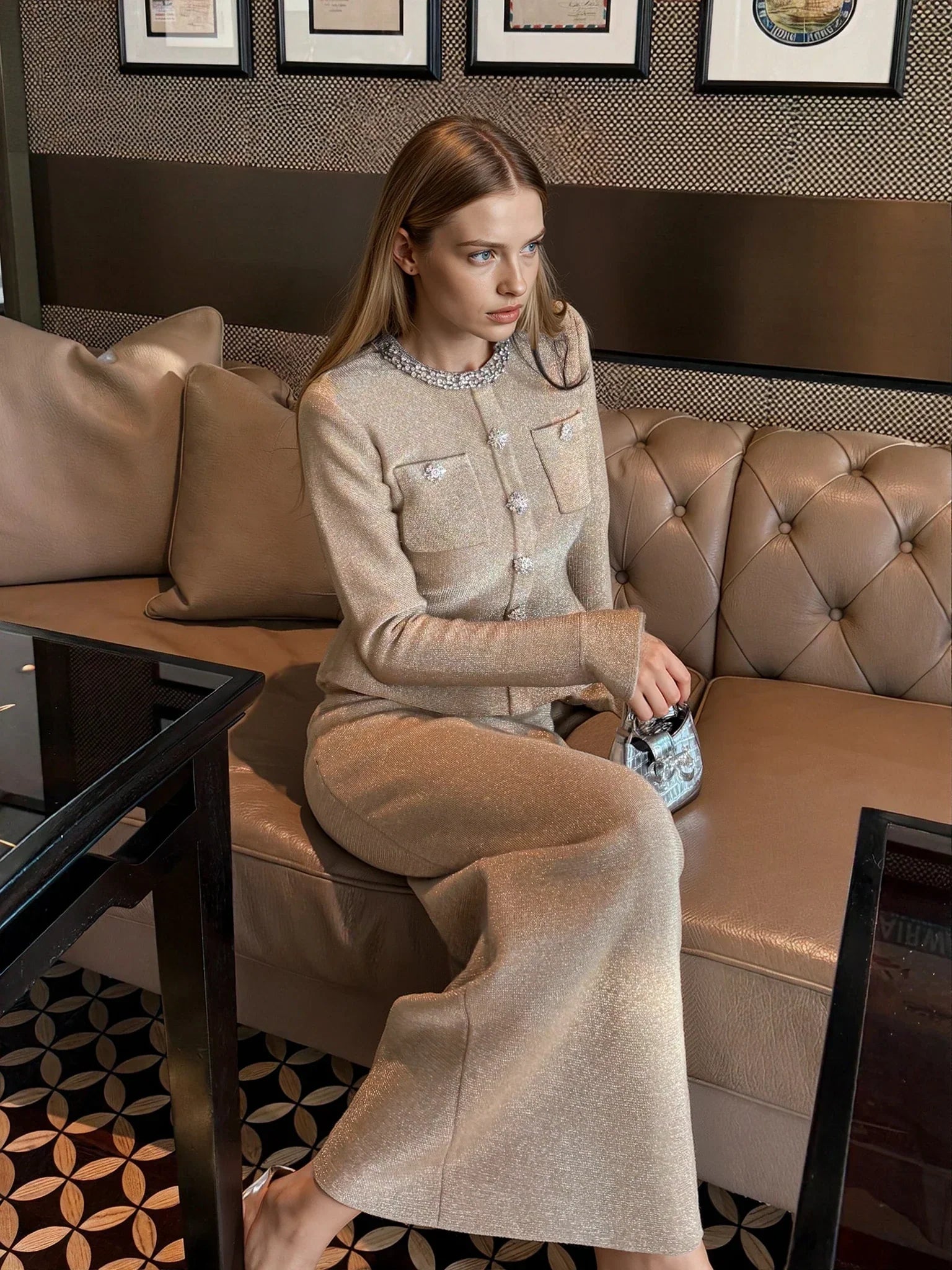 Işıltılı altın rengi ve pratik detaylarıyla dikkat çeken bu örgü elbise, şıklığı ve konforu bir arada sunuyor. Yüksek bel tasarımı ve hafif esnek kumaşıyla vücut hatlarınızı öne çıkarır. Çıkarılabilir omuz pedleri, ön patlet ve cepleriyle hem çok yönlü hem de stil sahibi bir seçenek.