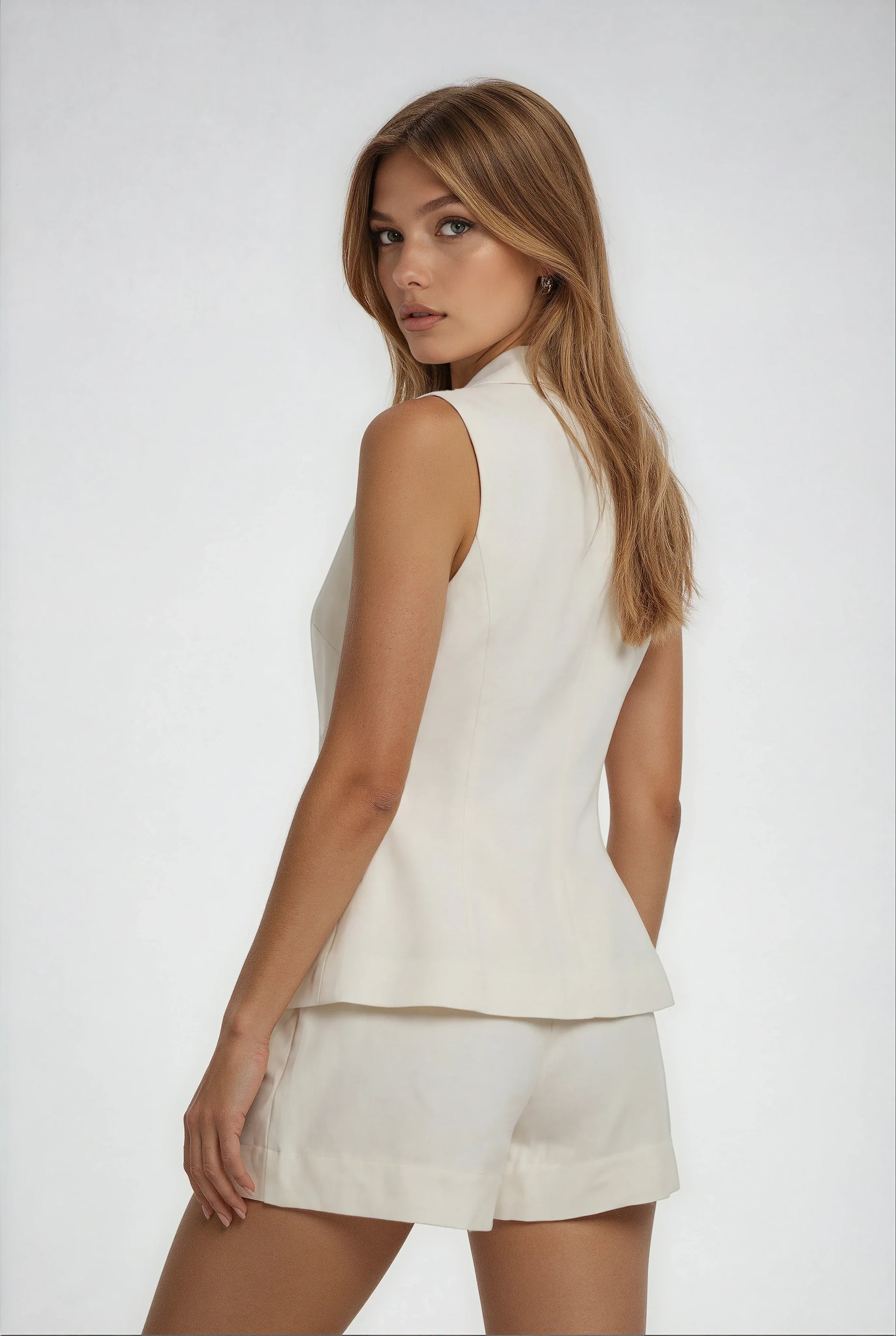 Bu takım, keten karışımı kumaşın doğal ve şık duruşunu pratik bir iki parça tasarımda sunuyor. Kısa üst, öndeki çıtçıt düğmeleri ve cepleriyle günlük şıklığı vurgularken, yüksek bel ve yan fermuarlı şortu rahat ve modern bir görünüm tamamlar. Üstün astarlı yapısı ve şortun lastikli beli gün boyu konfor sağlar. Not: Keten kumaş, ara sıra ütü gerektirebilir.