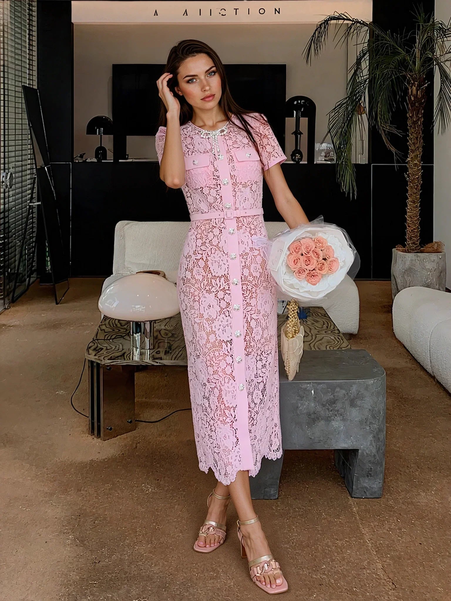 Narin lotus pembesi rengi ve zarif dantel süslemeleriyle romantik bir tarz sunan bu elbise, şıklığı ve kadınsılığı bir araya getiriyor. Yüksek bel tasarımı ve göğüs desteğiyle şık bir görünüm vadeden model, gizli düğmeli pat detayı, askılı bluz ve kemer ile tamamlanıyor. Cepleri pratik bir kullanım sağlar.