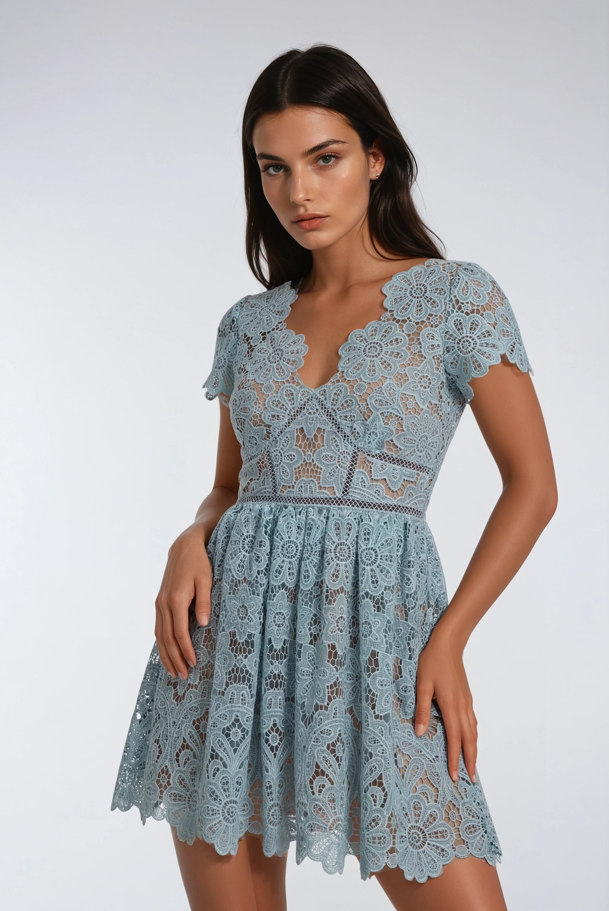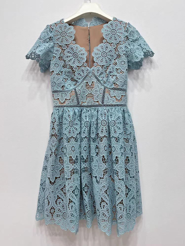 Özel Dantel İşlemeli Beyaz Mavi Mini Elbise