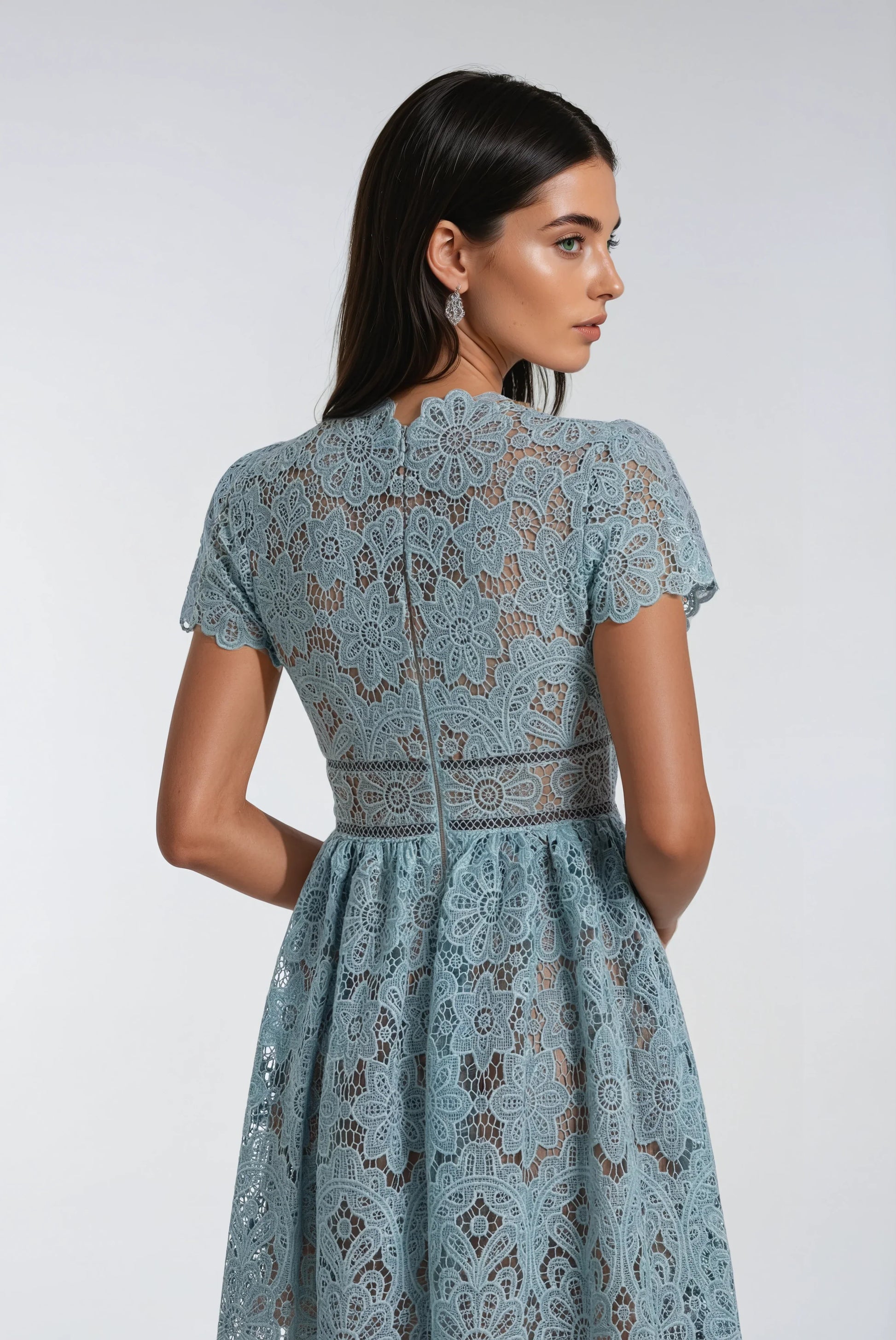 Bu mini elbise, özel dantel işlemeleri ile beyaz ve göl mavisi rengini zarif bir uyumda buluşturuyor. Vücudu saran kesimi ve yüksek bel tasarımıyla şık ve genç bir görünüm sağlar. Öndeki fermuar ve kullanışlı cepleri pratik bir kullanım sunarken, iç astarı konforu artırır. El işi dantel detayları her elbiseye özgün bir karakter katar.