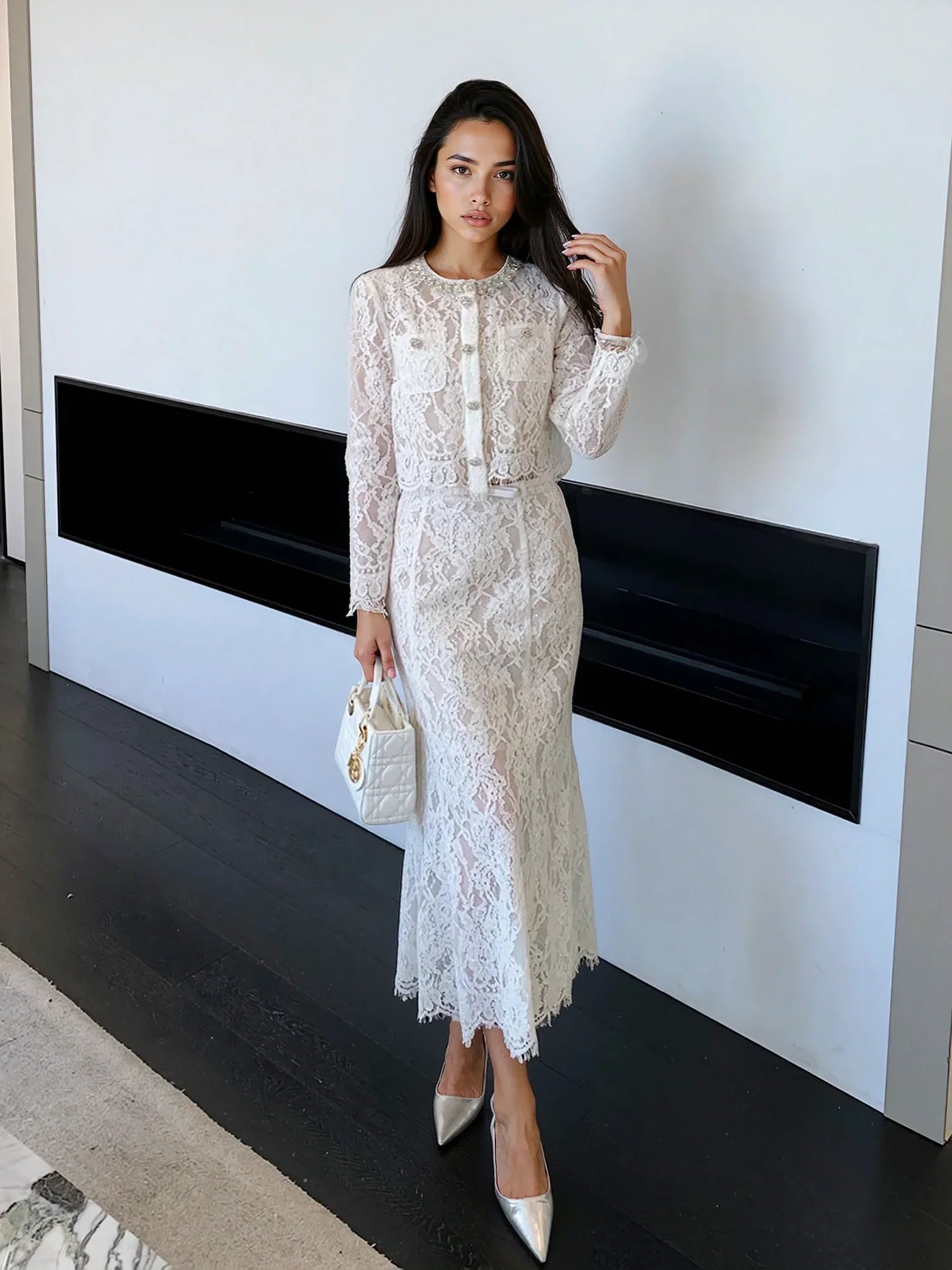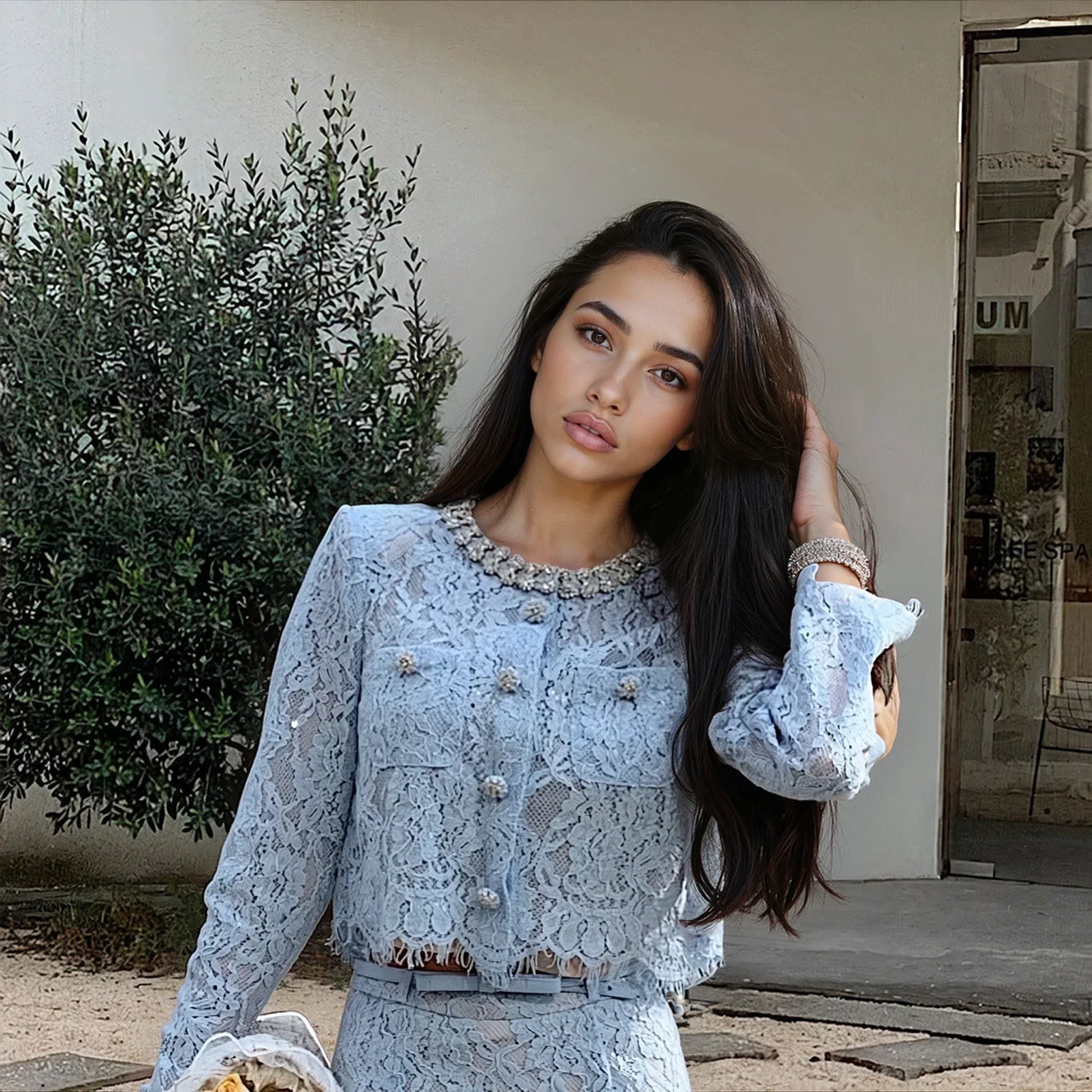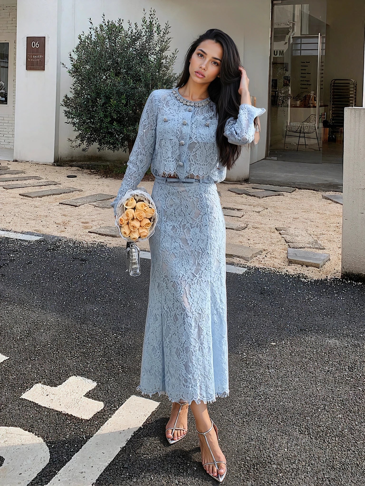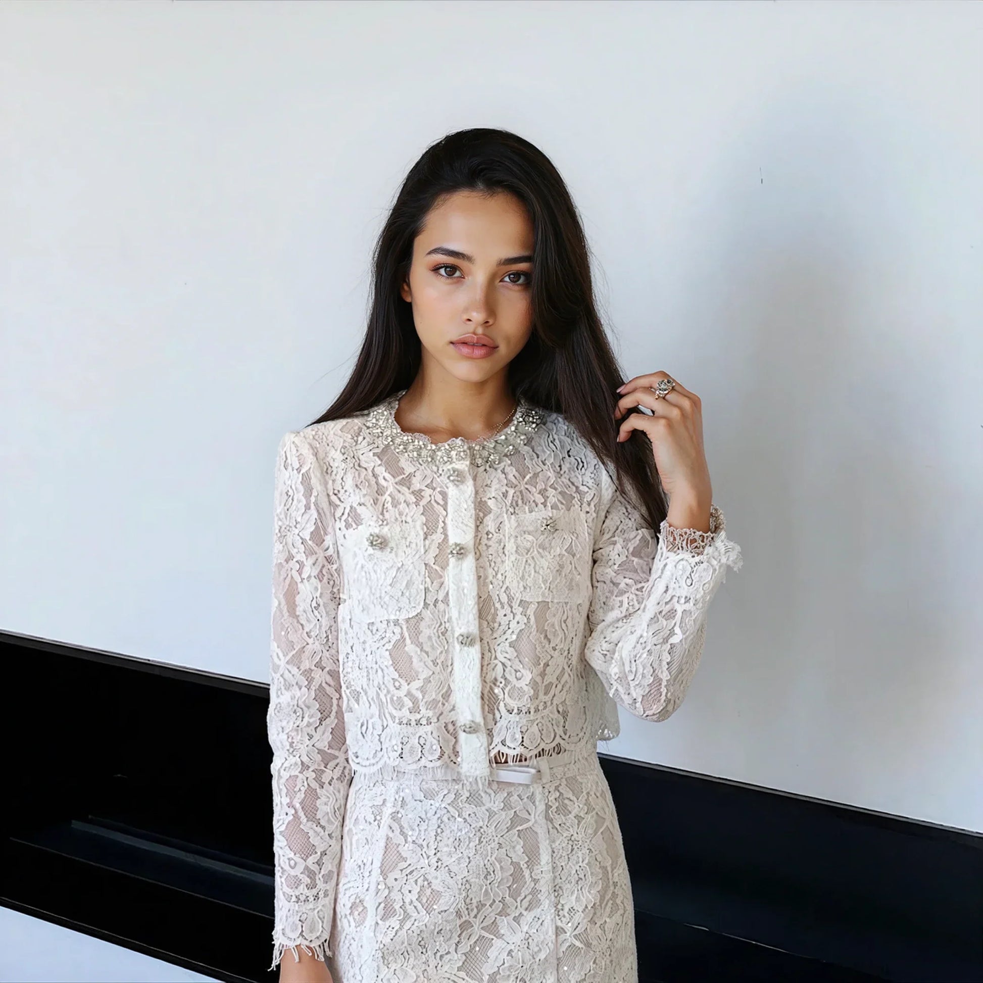 Zarif kirpik dantel işçiliği ve saf beyaz veya mavi seçenekleriyle göz alan bu iki parçalı takım, romantik ve şık bir tarz sunuyor. Üst kısım astarlı, askılı, vatkalı omuzlu ve çıtçıtlı düğmelidir. Etek ise yüksek bel tasarımı, kemer detayı, yan fermuarı ve astarlı ucuyla tamamlanıyor. Her iki parça da ceplidir. Üst (ceket) biraz bol kesimlidir.