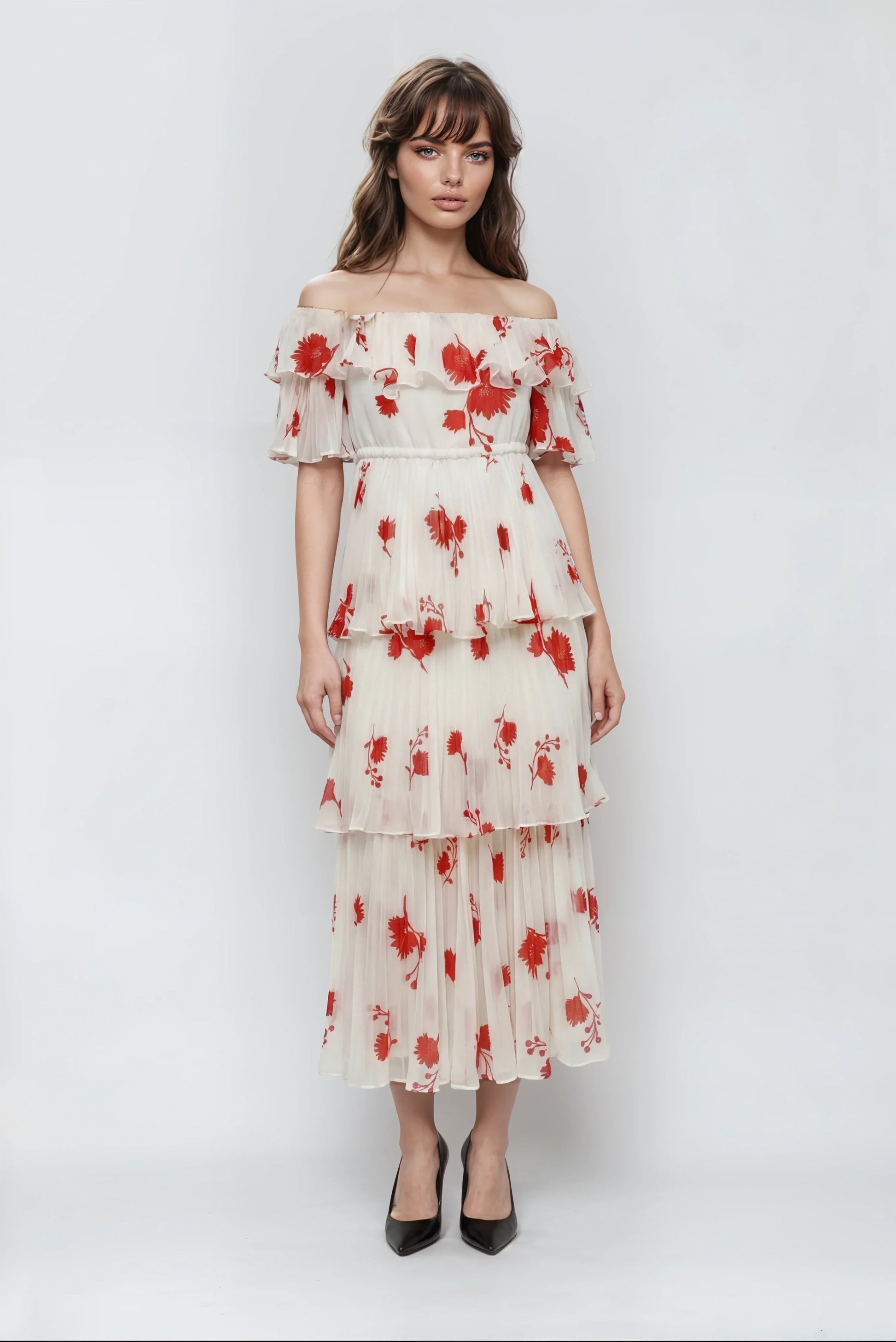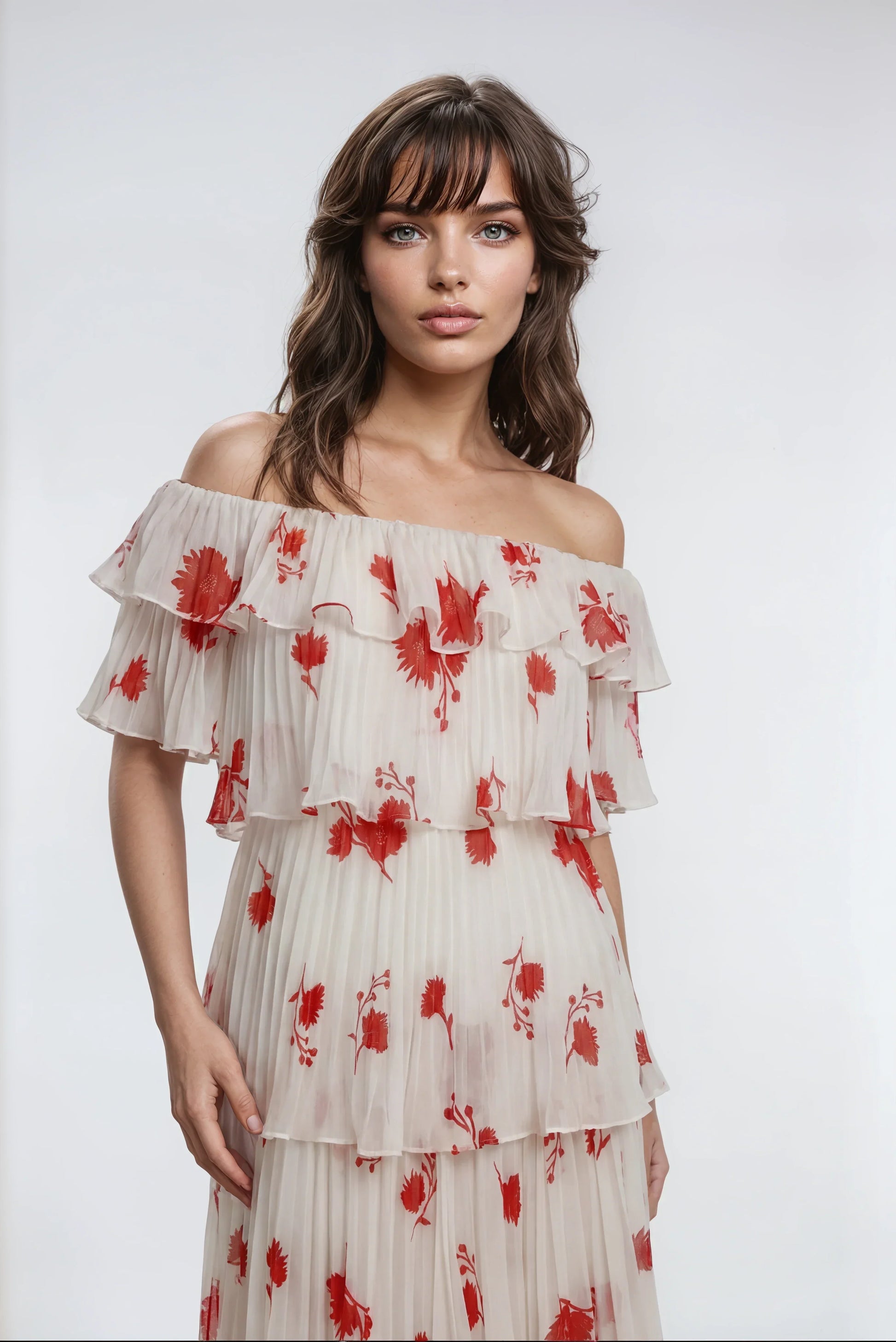 Bu midi elbise, zarif baskılı şifon kumaşı ve nötr bej rengiyle şık ve modern bir görünüm sunuyor. Vücudu saran kesimi ve yüksek bel tasarımıyla dengeli ve zarif bir görünüm sağlar. Arkadaki fermuar ile kolay giyilip çıkarılırken, iç astarı konforu artırır. Baskıdaki doğal hafif rastgelelik her elbiseye özgün ve sanatsal bir karakter katar.