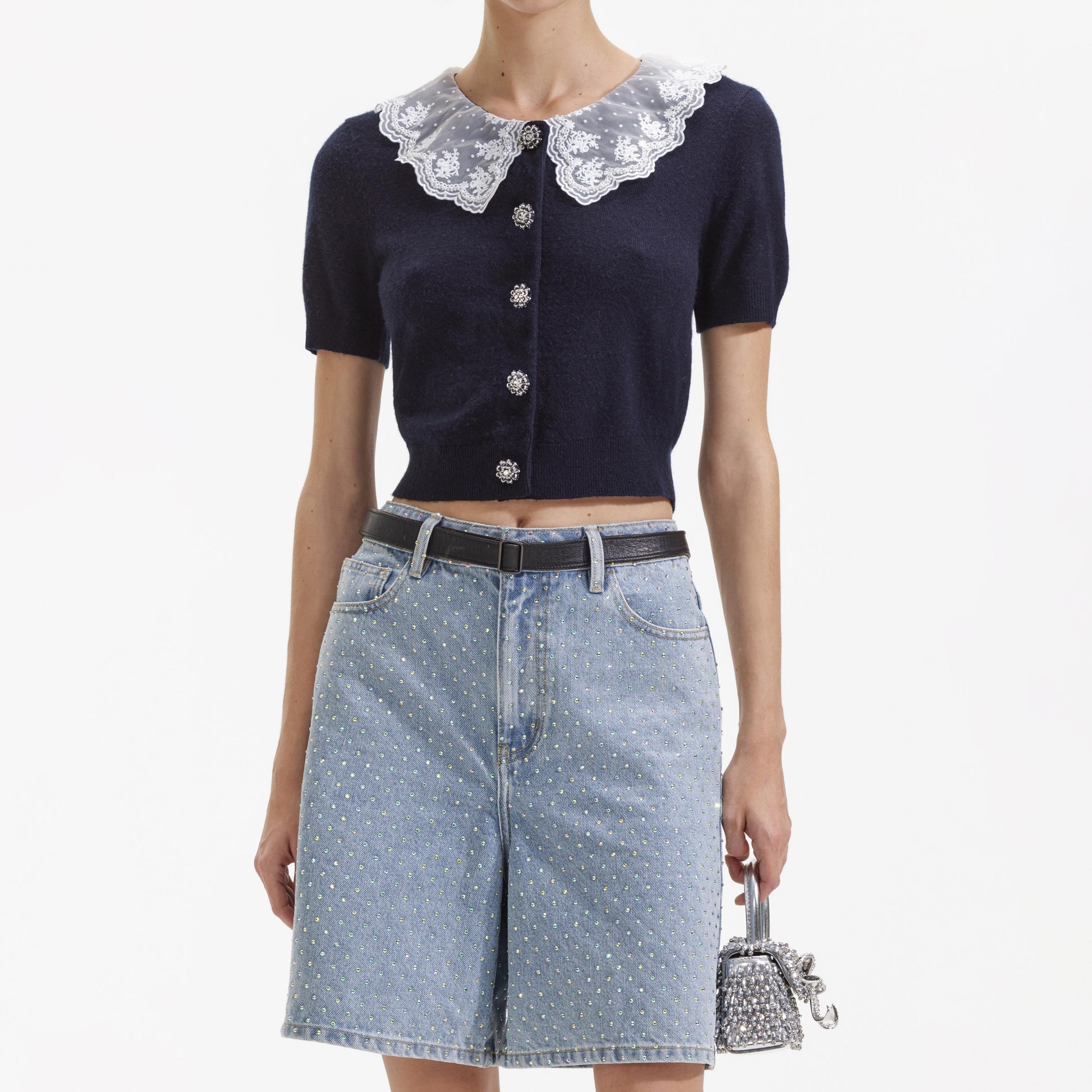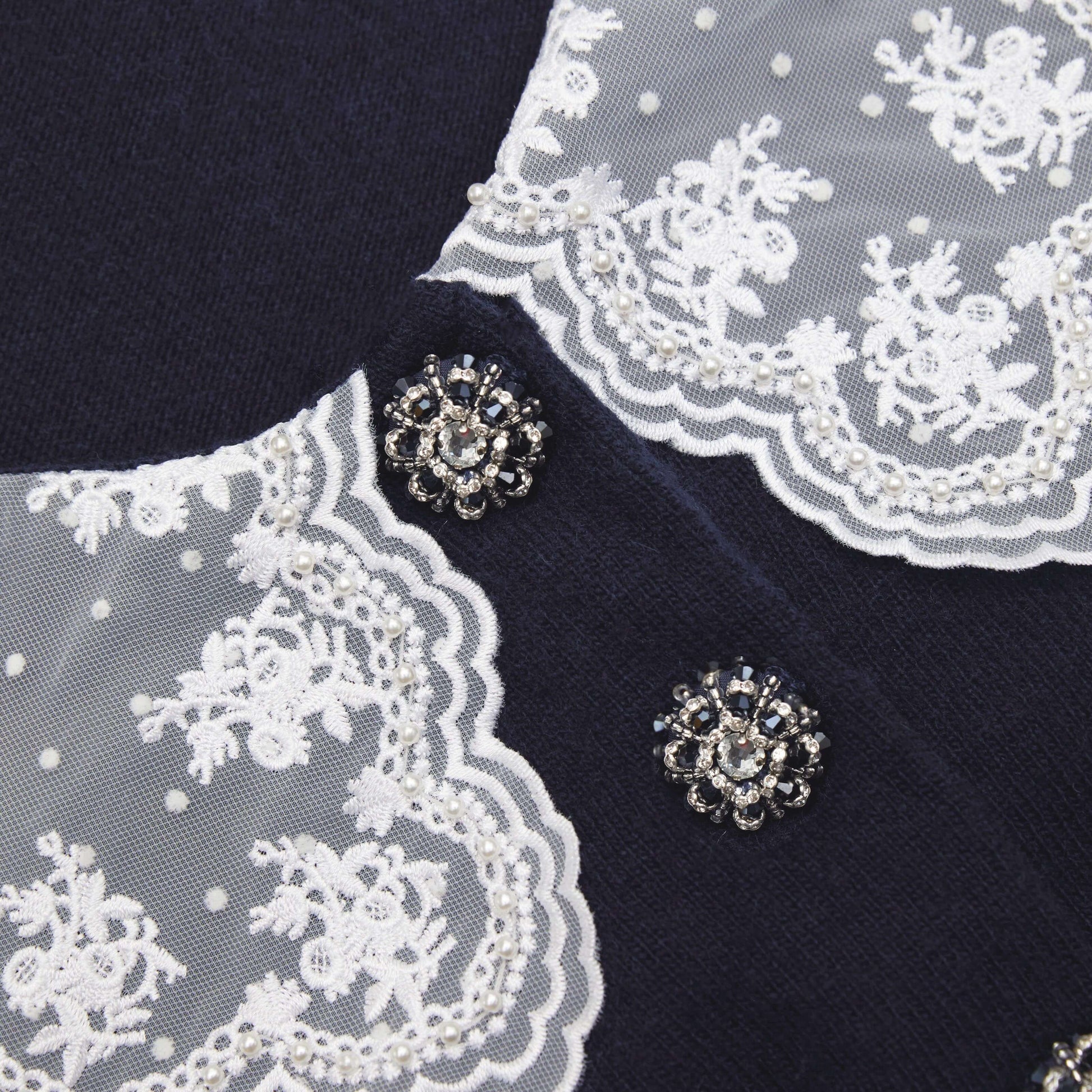 Önünü saran diamanté düğmeleri kadar şirin olan bu hırka, süper yumuşak kaşmir karışımı ile üretilmiştir. Retro şık dantel yakası ve kısa kesimiyle, randevu geceleri için idealdir.
