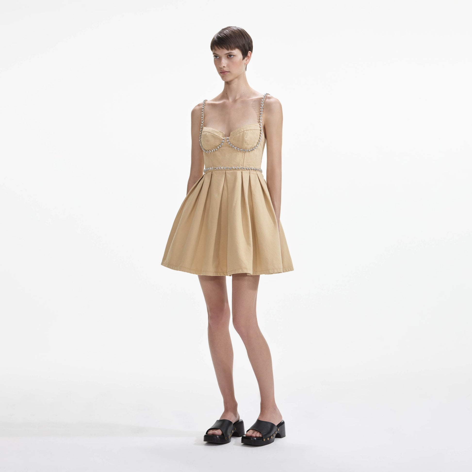 Şık bir parti elbisesi, soğukkanlı bir kız havasıyla bej denim bu modelin vücuda oturan üst kısmı, taşlı süslemelerle tamamlanmıştır. Tam mini eteğini dans pistinde göstermek için stilettolarla kombinleyin.
