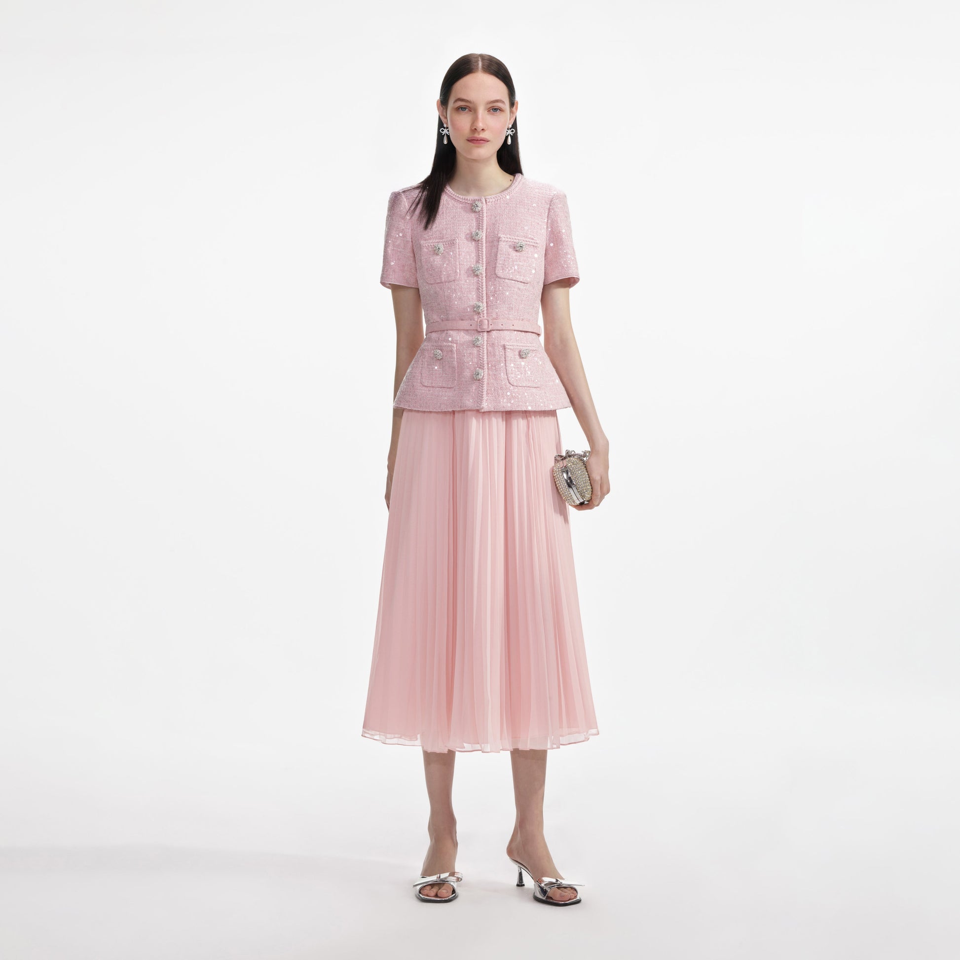 Kusursuz bir şekilde feminen ve hafif bir parıltıyla, terzi işi payetli bukle kumaş bu elbisede eterik pileli şifonla buluşuyor. Terzi işi üst kısım, formu vurgulamak için kemerli – randevu gecesine hazır.