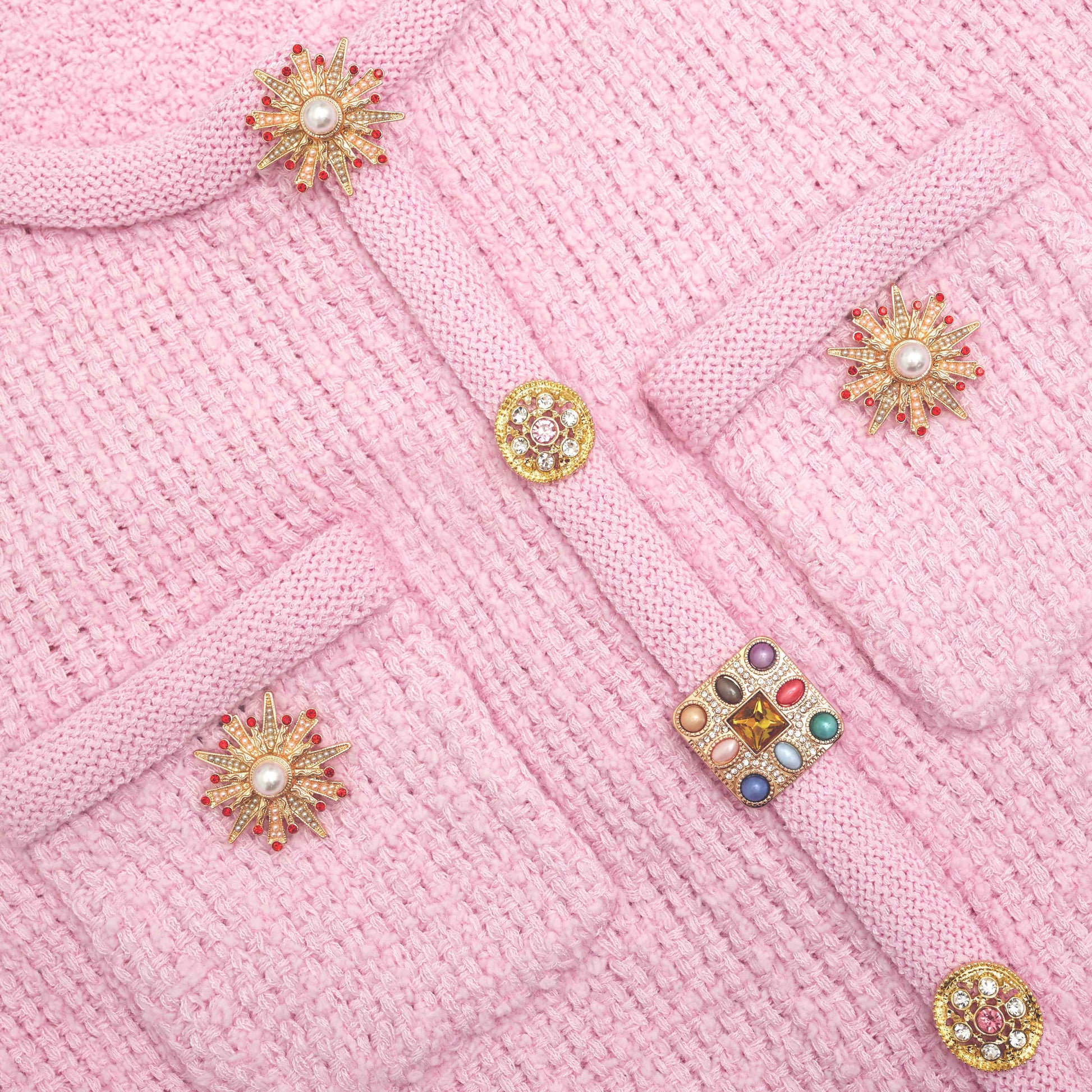 Oyuncu, feminen ve bele kadar kesilmiş bu dokulu örme üst, brunch'tan kokteyl saatlerine kadar giden rahat bir siluet sunar. Üstüne bir de parlaklık katan işlemeli mücevher düğmeleri var.