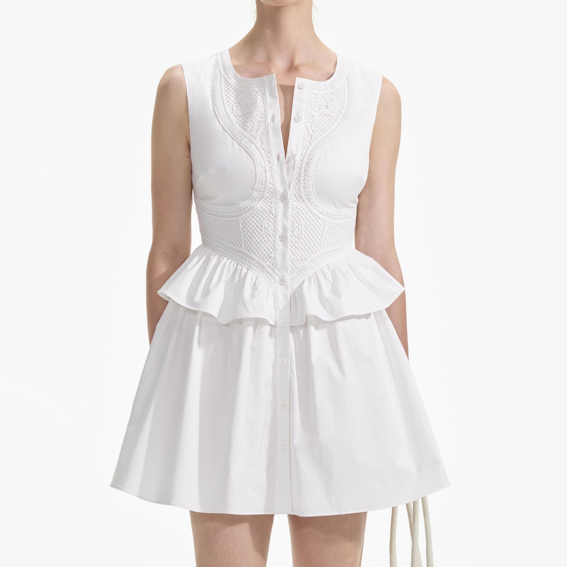 Yaz beyazları, bu pamuklu mini elbise kadar harika hiç görünmemişti. Dantel panel detayları ve peplum bel ekstra romantizm katıyor – hem kumlu plajlar hem de şehir gezileri için sandaletlerle kombinleyin.