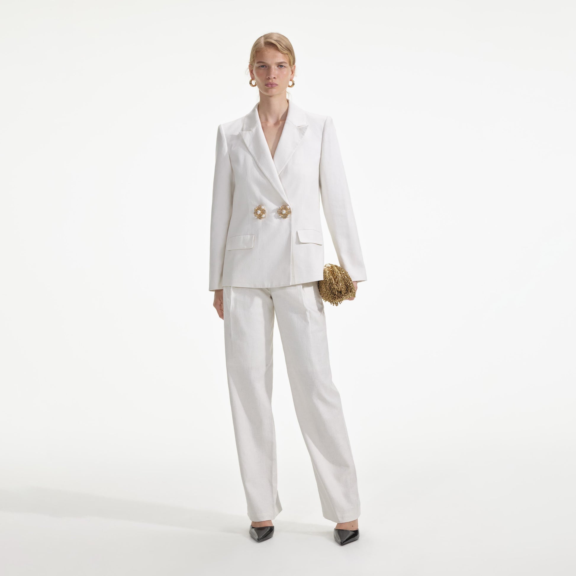 Mükemmel kesimle, bu beyaz keten blazer, çift düğmeli kesimi ve mücevher işlemeleri ile kentli bir zarafet sunar. Onu kot pantolonla rahat kombinleyebilir veya aynı kumaştan pantolonla eşleştirebilirsiniz.