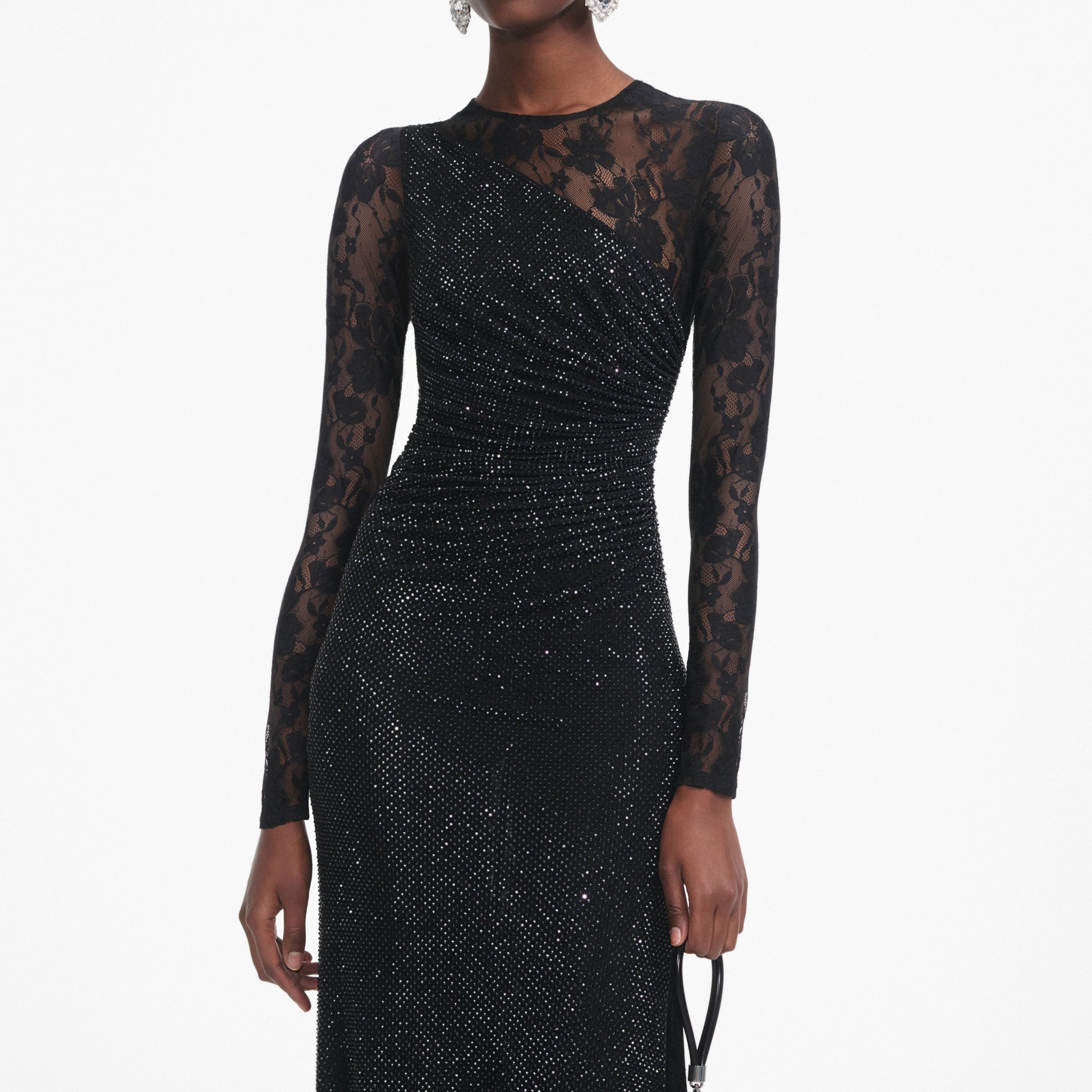 Taşlı dantel, bu maksi elbiseye parlak bir çekicilik katarken, ön kısmındaki büzgü detayları ve dökümlü etek, heybetli silüetini tamamlar. Giriş yaparken topuklu ayakkabılarla kombinleyin.