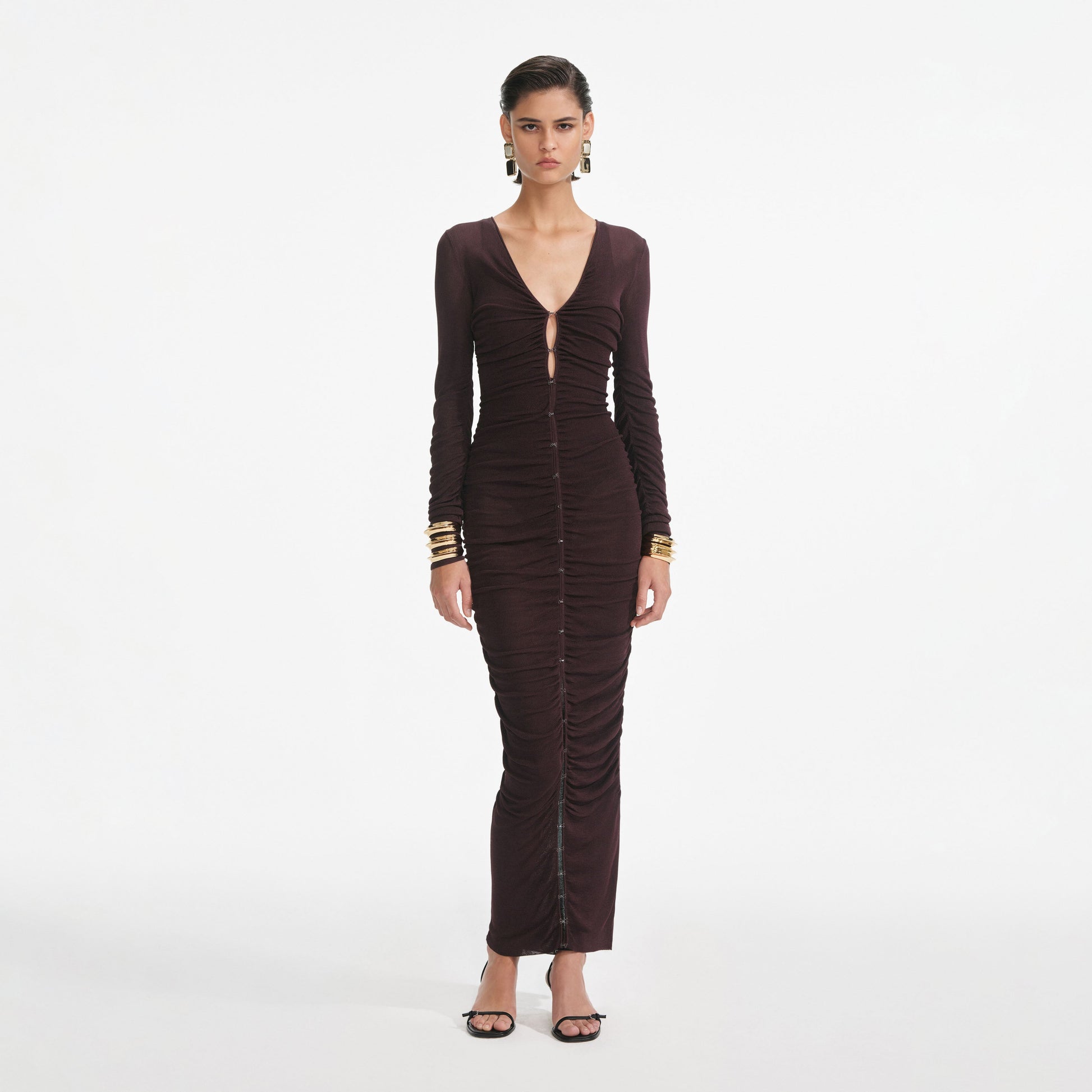 Derin V yakası ve kancalı & gözlü detaylarıyla bu şeffaf viskon triko elbise içinde görün ve fark edilin. İçindeki bodysuit ekstra destek sağlar – şehri fethetmek için yüksek topuklu ayakkabılarla giyin.