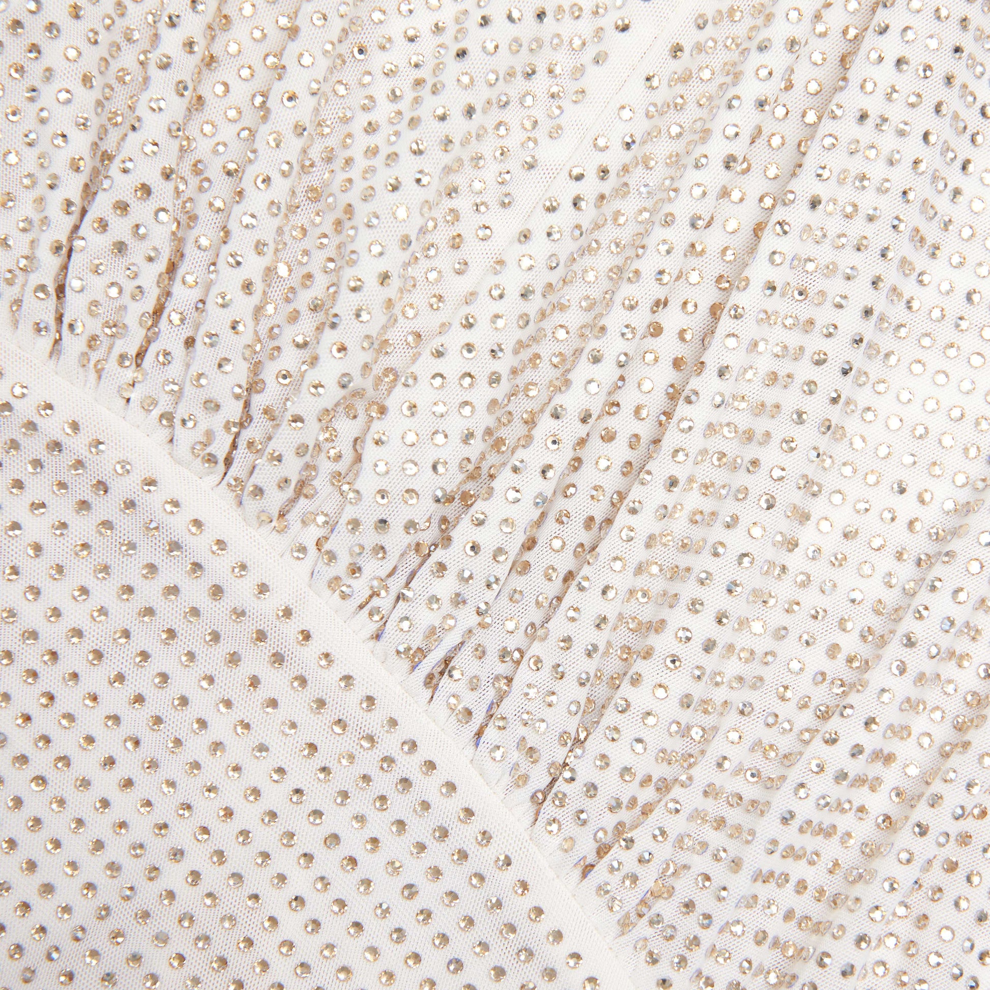 Şampanya renkli taşlarla süslenmiş file kumaştan üretilen bu yüksek enerjili midi, parlak dokusunu şık bir siluet ve uyumlu cesur bir kesimle birleştiriyor. Ekstra dram için gösterişli küpelerimizi ekleyin.
