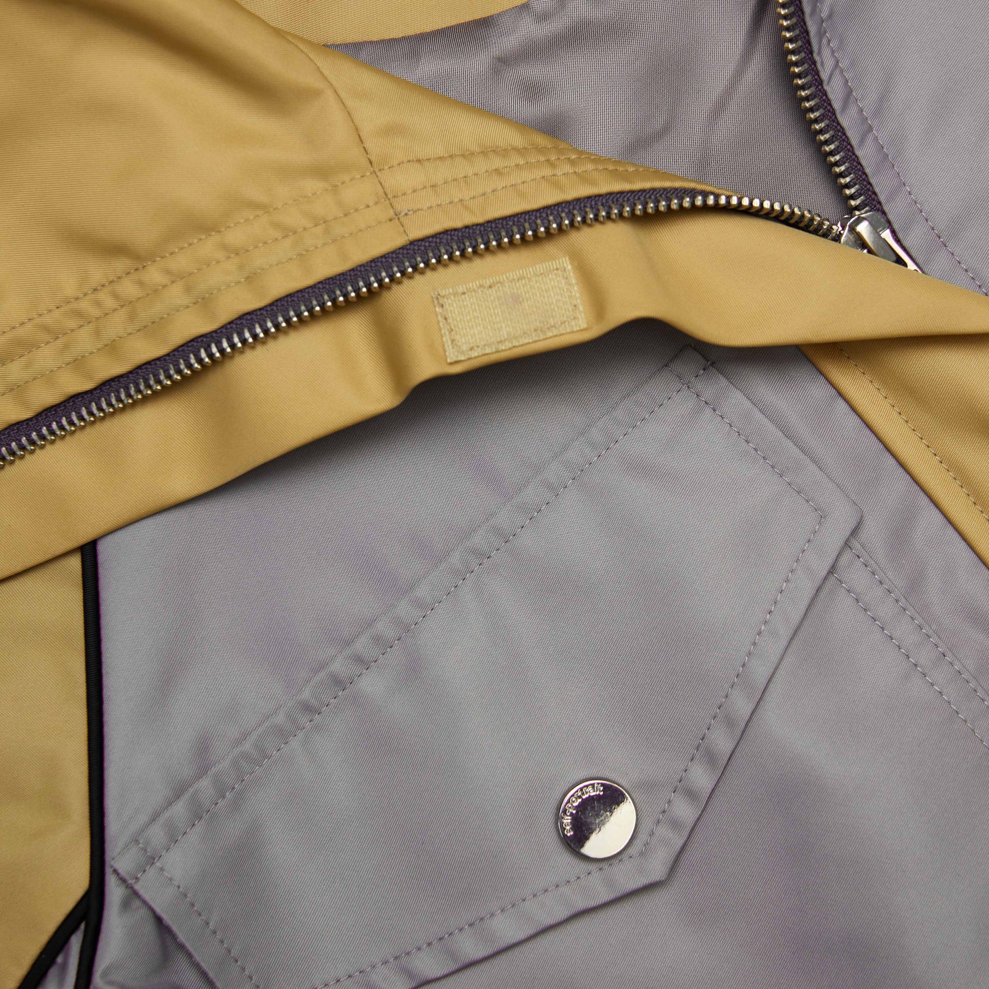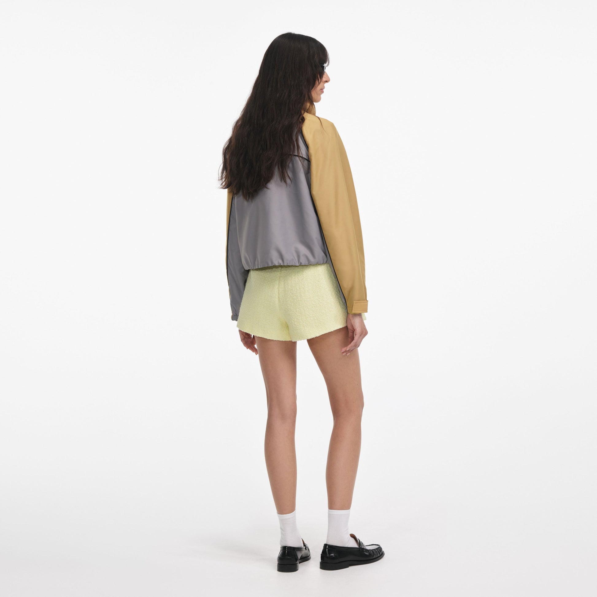 Sportif, bu gri ve sarı rüzgarlıkta şık bir hale geliyor; abartılı yakasıyla zarif bir etki yaratıyor. Rahat kesimini gündüz için denim ile ya da kızlar gecesi için mini etekle kombinleyin.