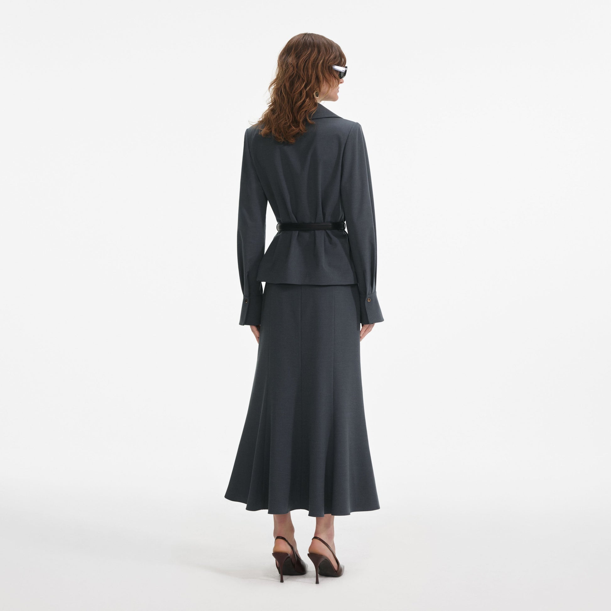 Günlük şıklık, ortaya çıkmış fermuarı ve kuşaklı peplum beliyle dikkat çeken bu gri twill midi elbise ile kolayca sağlanır. Gün içinde brogues ayakkabılarla, akşam maceralarında ise topuklularla çan formundaki eteğini sergileyin.