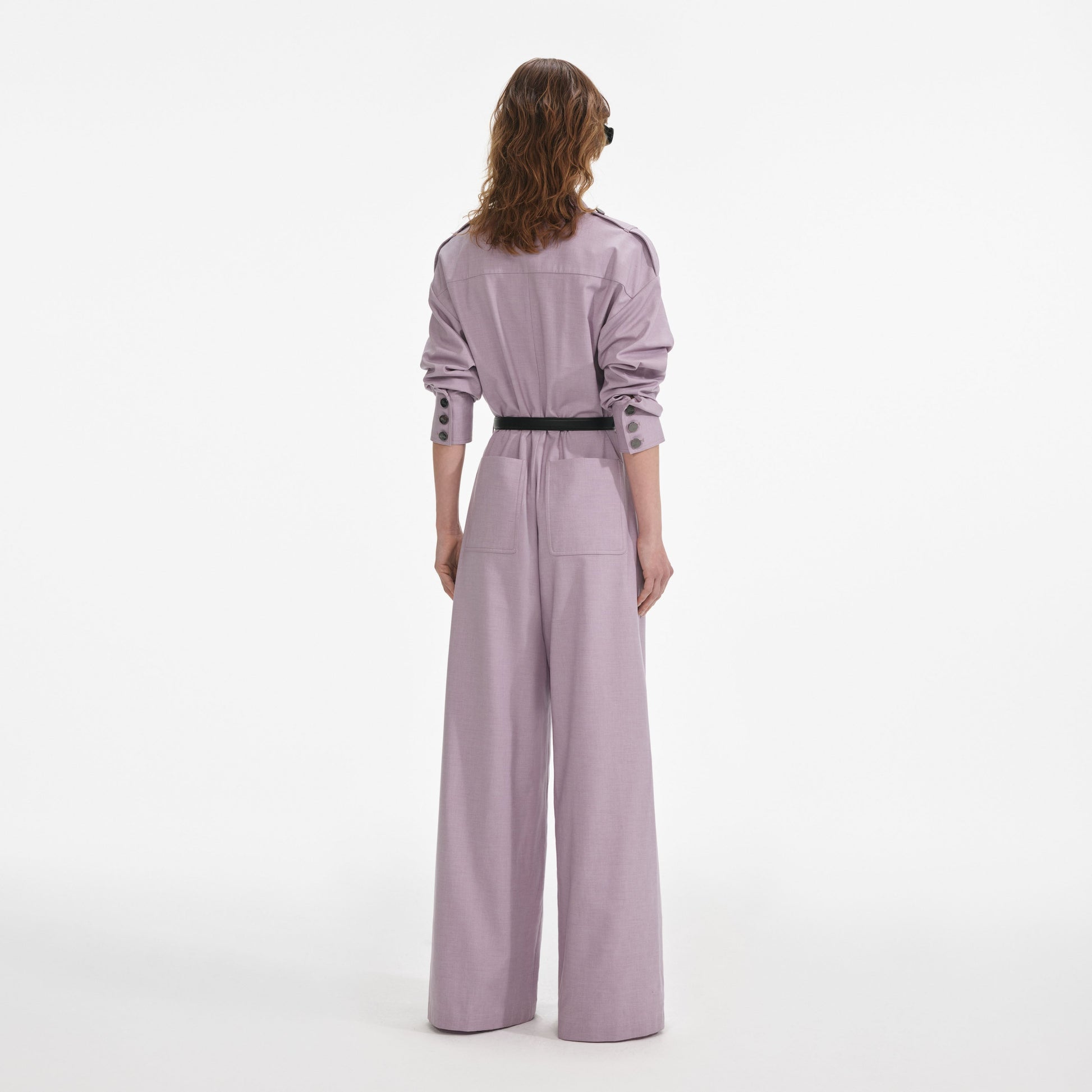 Kolayca giyilip çıkarılabilen, beli kemerle belirginleştirilmiş rahat bir siluete sahip lila saten tulum. Şehirde bir gün için babetlerle kombinleyin, kız gecesi için ise topuklularla şıklaştırın.