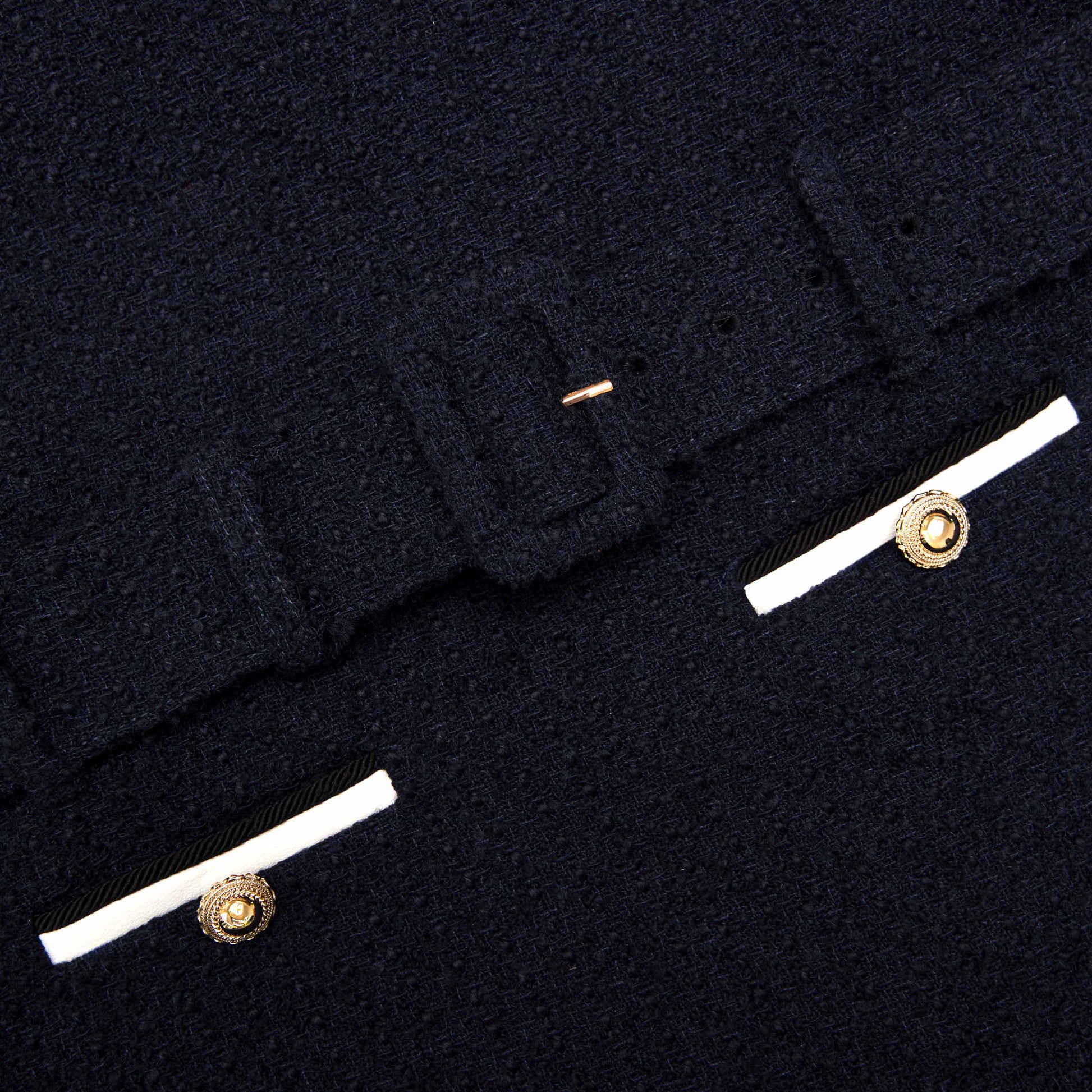 Altın düğme detaylarıyla dolu, preppy cazibesiyle bu lacivert bukle mini elbise içinde hanımefendi zarafeti sergileyin. Tonal bir kemer bele tanım kazandırır – gündüz broguelerle, gece ise topuklularla kombinleyin.