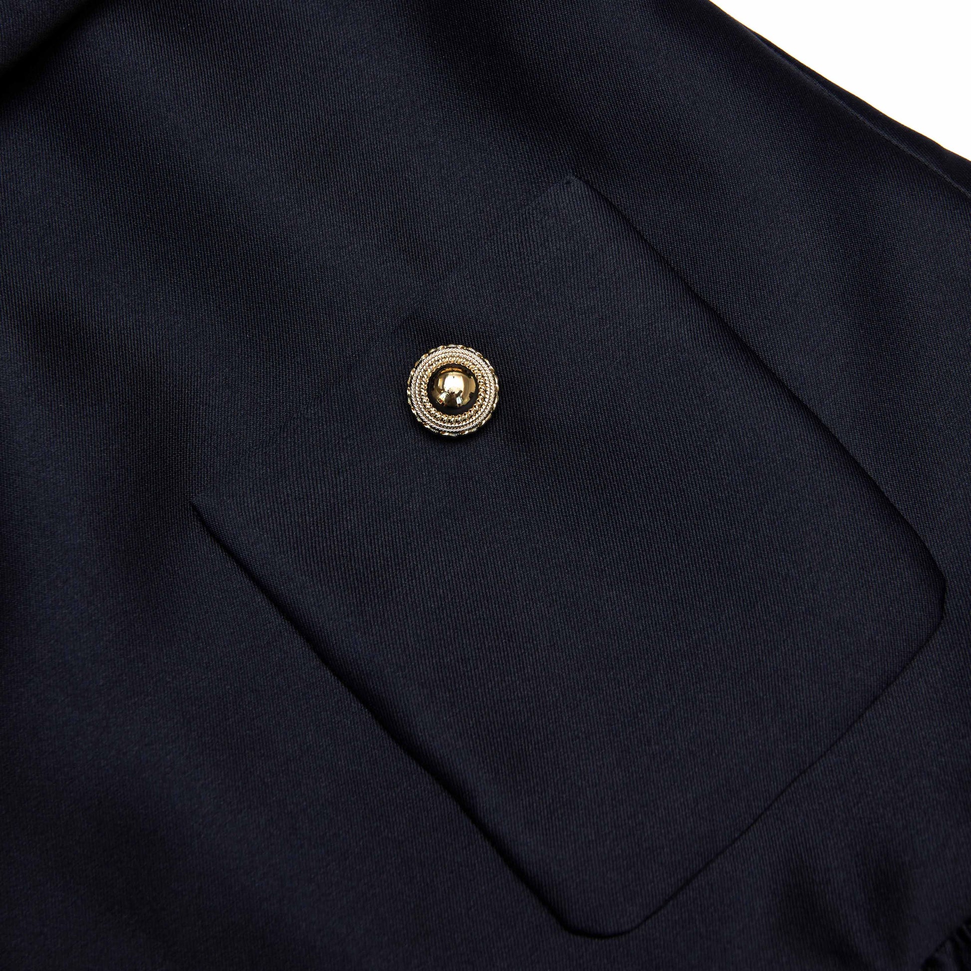Yapısı ve parlaklığı için lacivert tafetadan kesilmiş bu mini elbise, dikime dayalı şıklığı tanımlar. Kemerli bel ve altın düğmeler ekstra bir ışıltı katıyor – iddialı topuklularla dramatik kabarcık eteğini sergileyin.