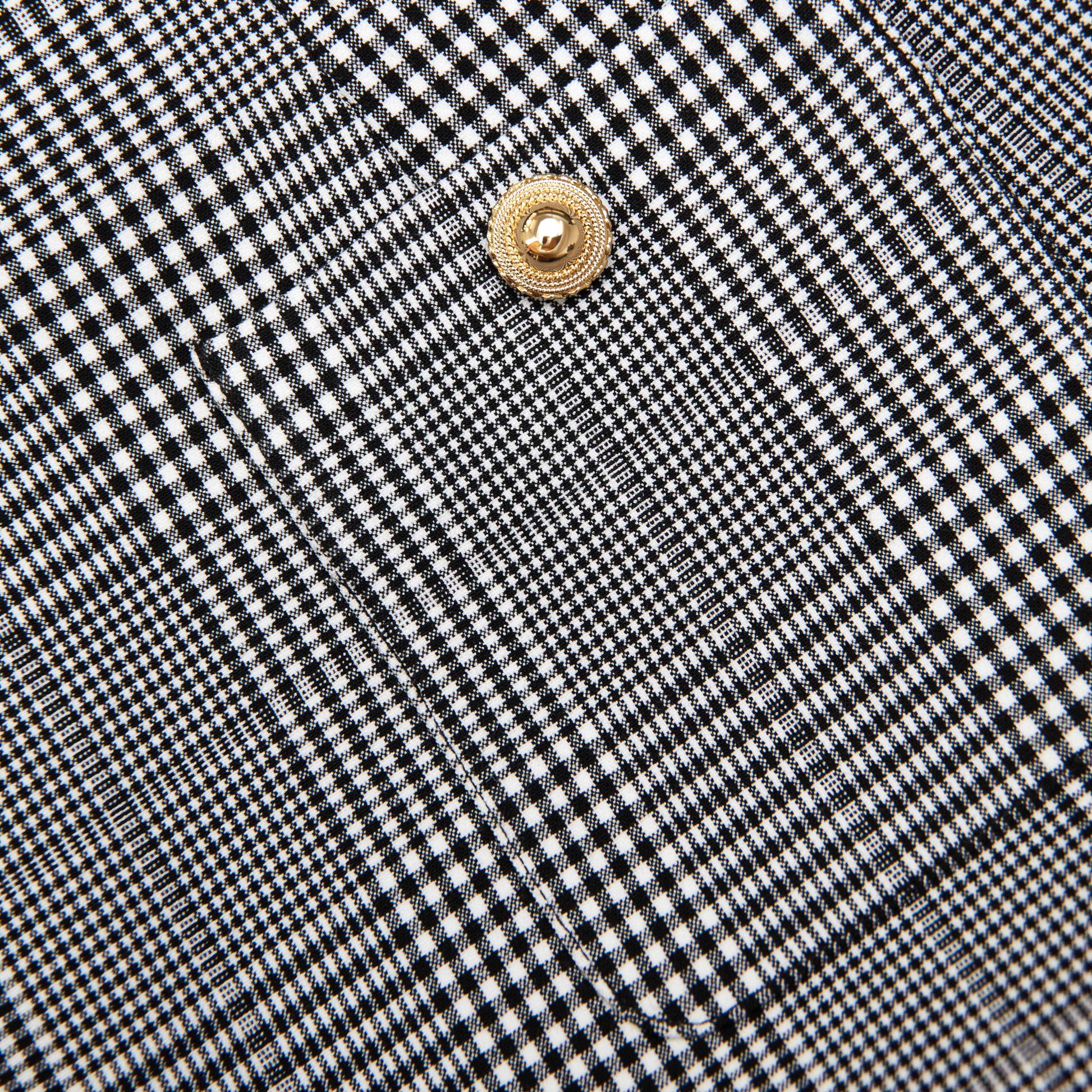 Klasik Prince of Wales deseninden kesilmiş bu mini elbise, terzi işçiliği şıklığını tanımlıyor. Beldeki kemer ve altın düğmeler feminen dokunuşlar katıyor – dramatik balon etek parçasını iddialı topuklularla sergileyin.