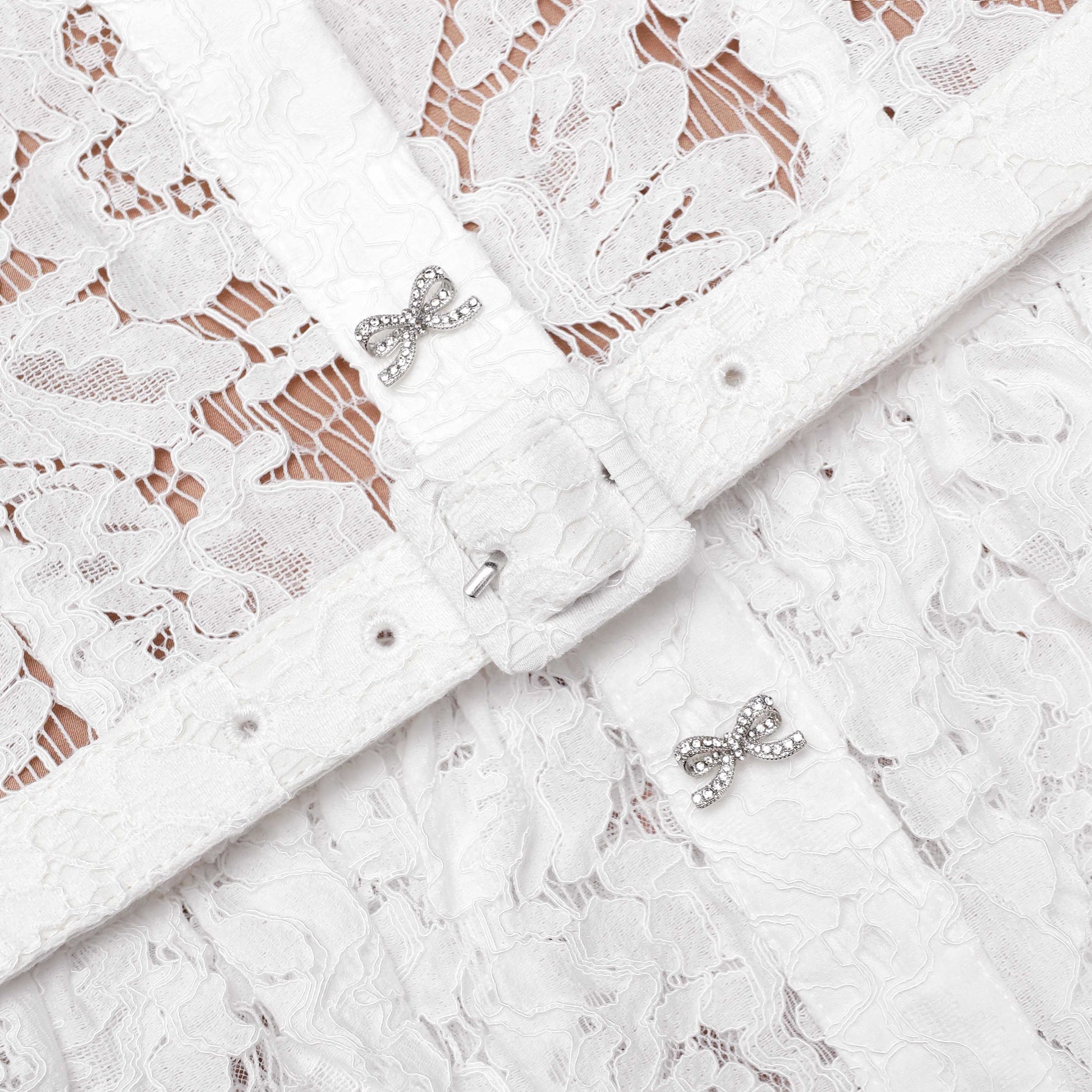 Zengin dokusu ile beyaz dantelden kesilmiş bu elbise, şık bir peplum ve taş detaylı fiyonk düğmelerle süslenmiştir. Formu güzelleştirmek için belden kuşaklıdır, oturtmalı midi eteğini göstermek için topuklu ayakkabılarla giyin.