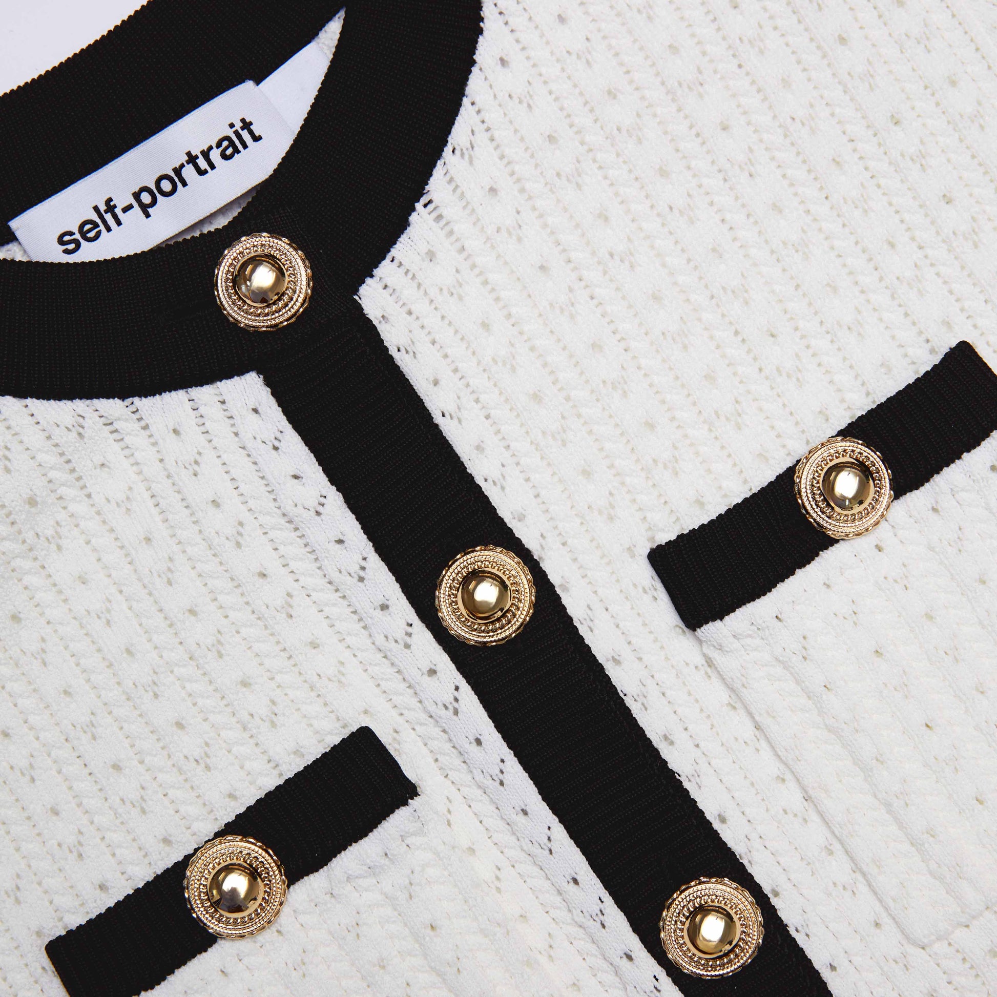 Peplum bele ve genişleyen eteğiyle vücudu güzelleştirecek şekilde tasarlanmış, kontrast detaylar bu beyaz pointelle triko elbiseye ekstra bir şıklık katıyor. Altın düğmelerini bizim iddialı küpelerimizle eşleştirin.