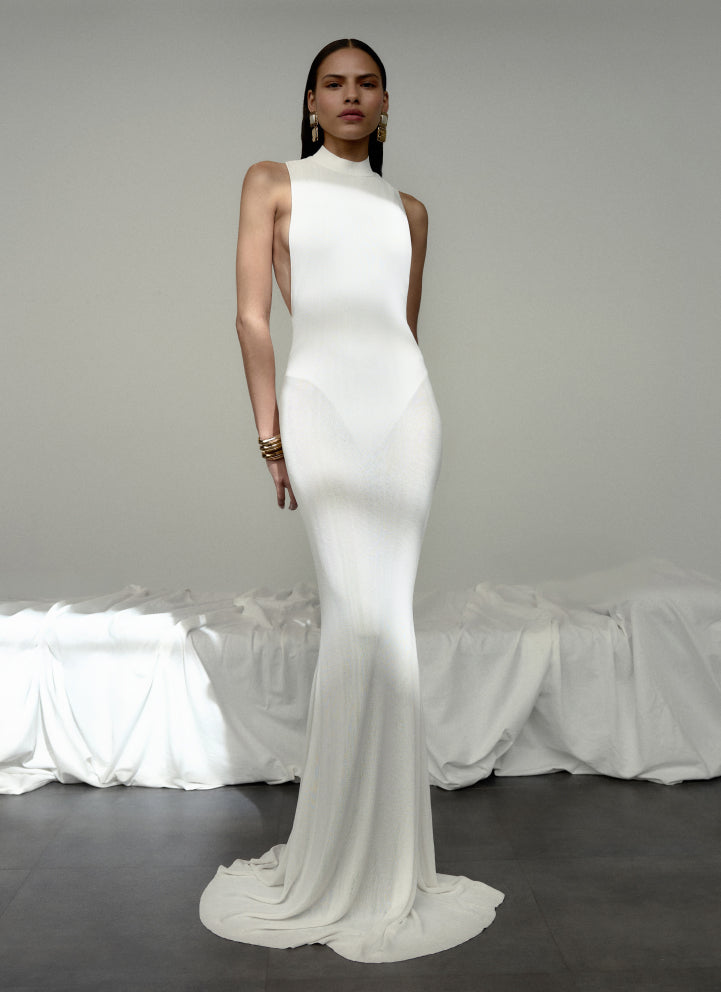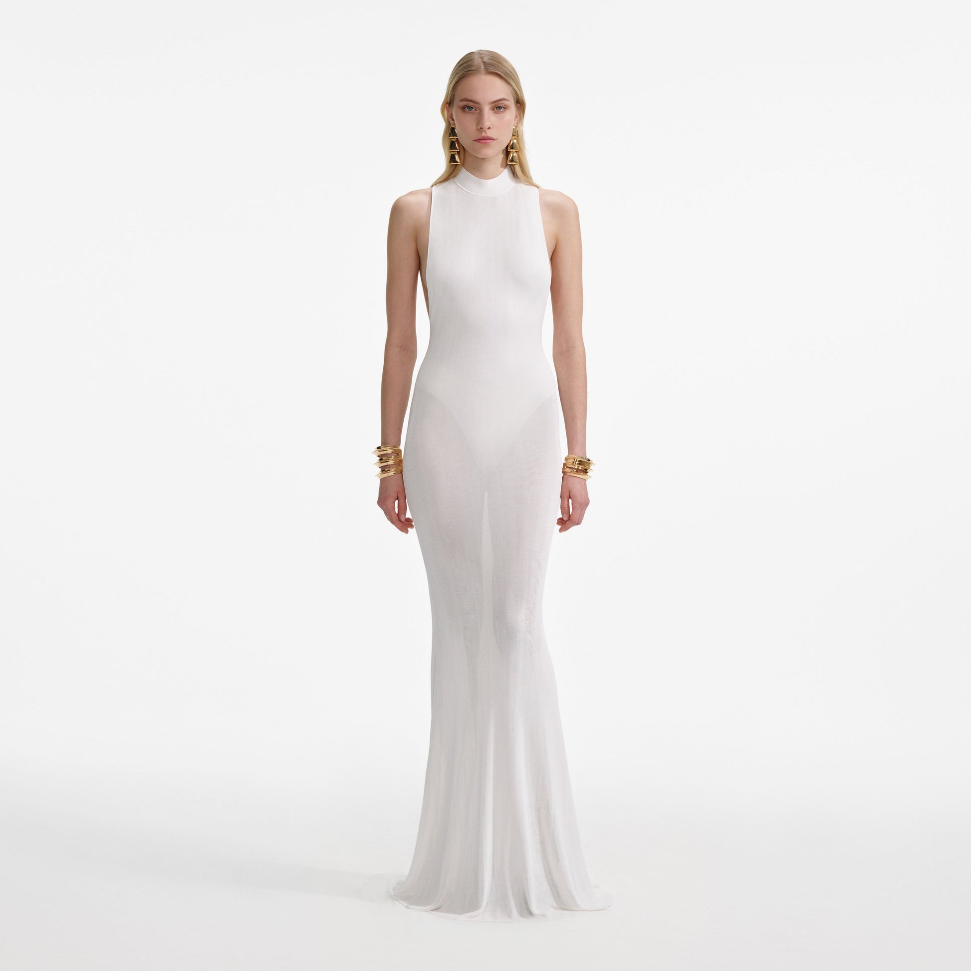 Şeffaf ve baştan çıkarıcı, bu beyaz viskon maxi elbise, derin yan dikişleri ve sırtı açık kesimiyle zarif bir çekicilik sunuyor. Yüksek yakalı iç bodysuit, unutulmaz bir gece için şık detaylar ekliyor.