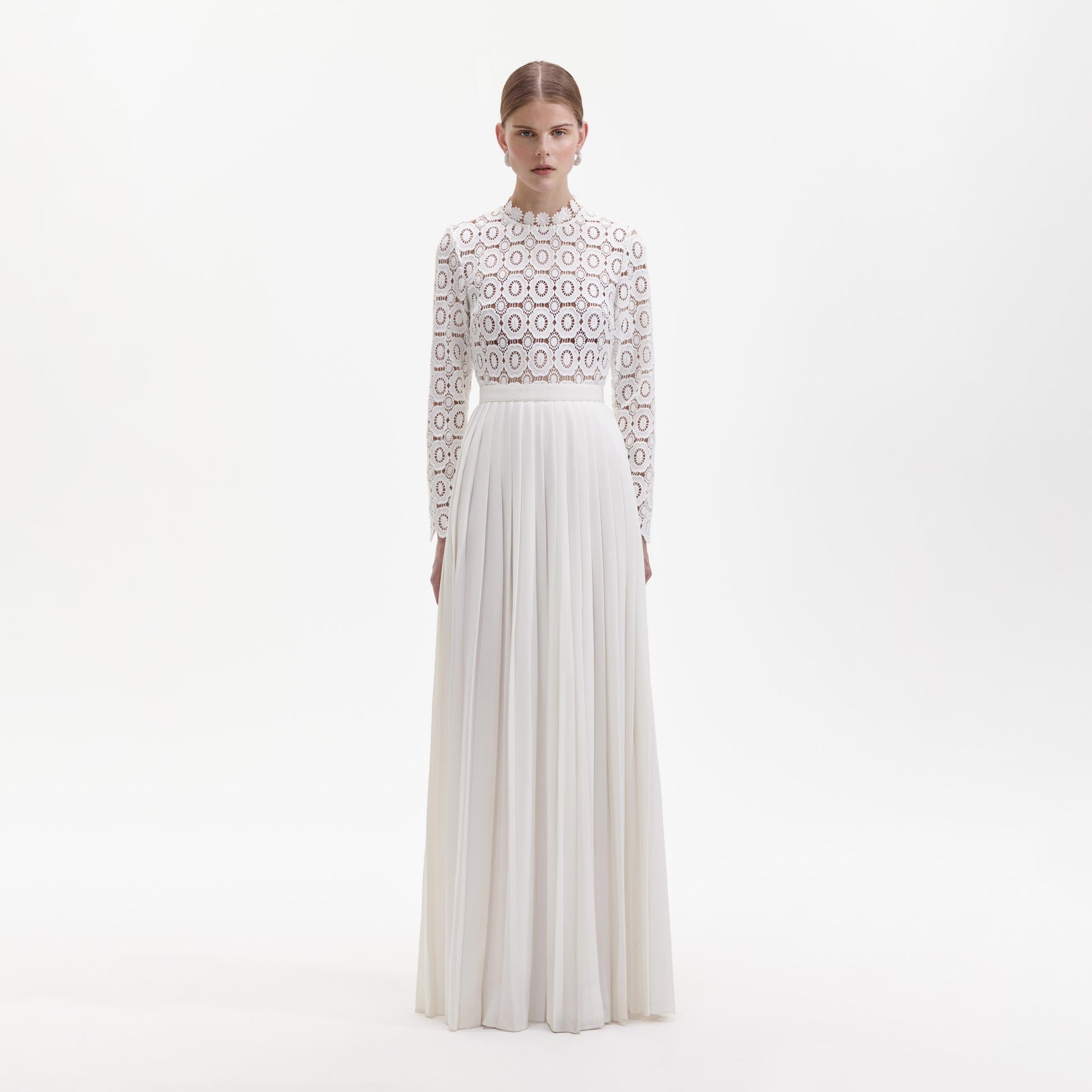Pileli Tığ İşi Çiçekli Uzun Elbise