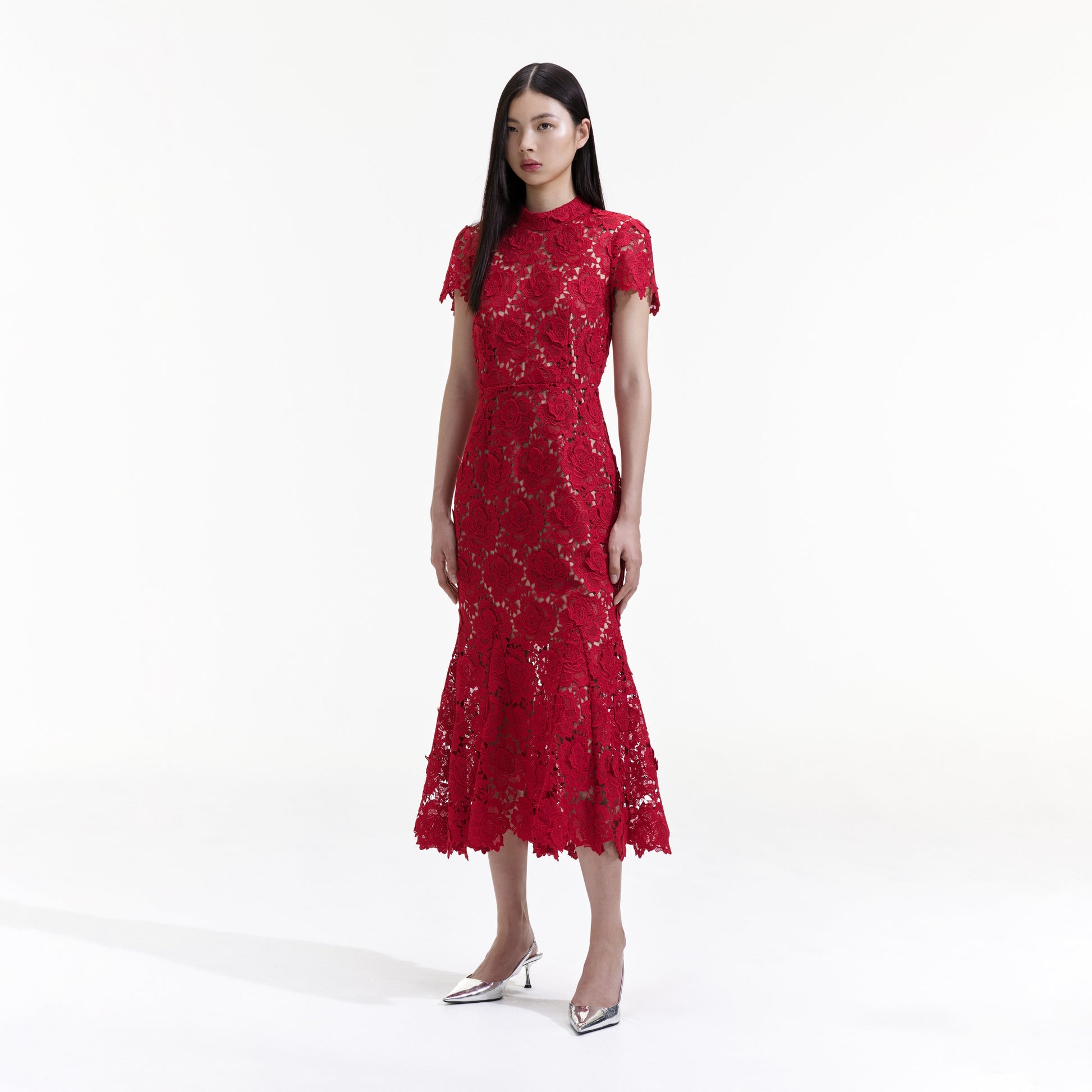 Bu sahneyi çalan çiçekli dantel elbiseyle şehri kırmızıya boyayın; şık bir yarım balıkçı yaka sunar ve feminen bir oturan ve kabaran siluete sahiptir. Bir sonraki gece davetiniz için iddialı topuklu ayakkabılarla eşleştirin.