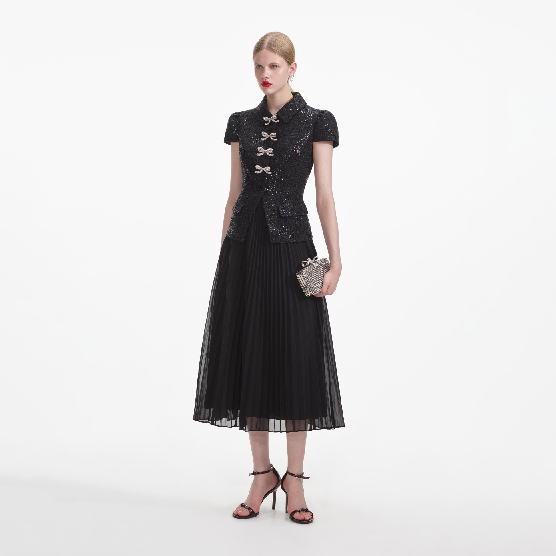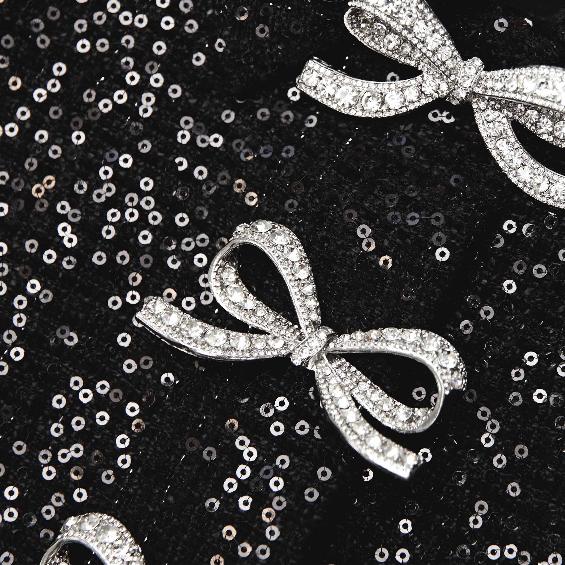 Her şey detaylarda: payetlerle süslenmiş bukle ve diamanté fiyonklar, bu ustalıkla dikilmiş elbiseye her yerde parlaklık katarken, peplum bele ve oturan feminen siluet, üzerine konan kirazlar gibi.