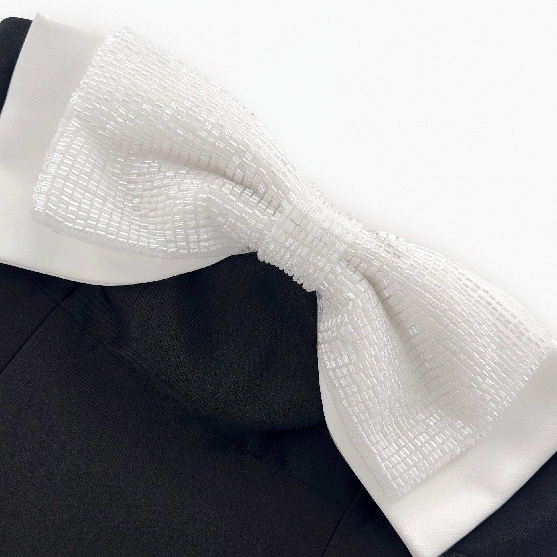 Yapısı ve parlaklığı için tafetadan üretilmiş bu fiyonk detaylı, omuzları açık elbise, eski Hollywood zarafetine eğlenceli bir gönderme yapıyor. Bir sonraki davetinizde onu bizim dikkat çekici fiyonk küpelerimizle kombinleyin.