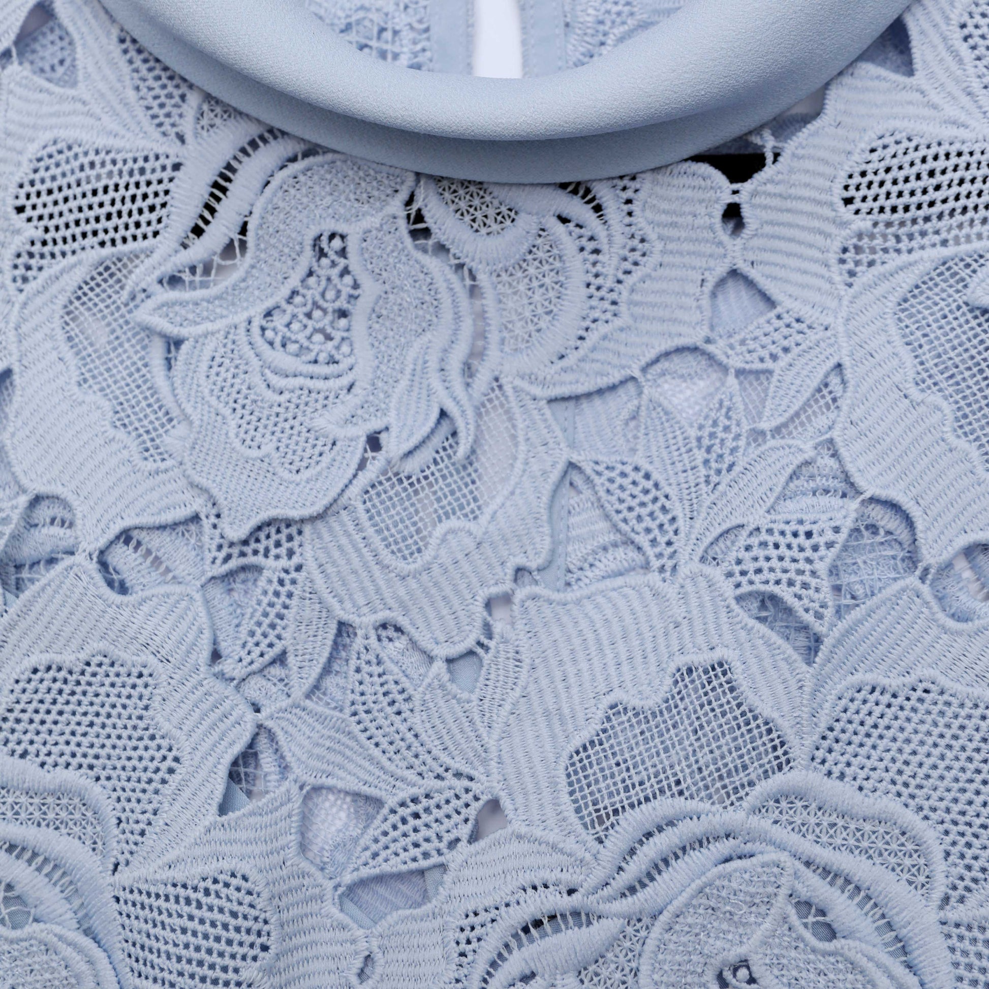 Rüya gibi bir mavi olan mavi gelincik mavisi dantelden kesilmiş bu elbise, şık bir oturan ve genişleyen siluetin yıldızıdır. Zarif yüksek yakasını iddialı küpelerimizle sergileyin ve bir sonraki gece gezmesi için topuklularla kombinleyin.