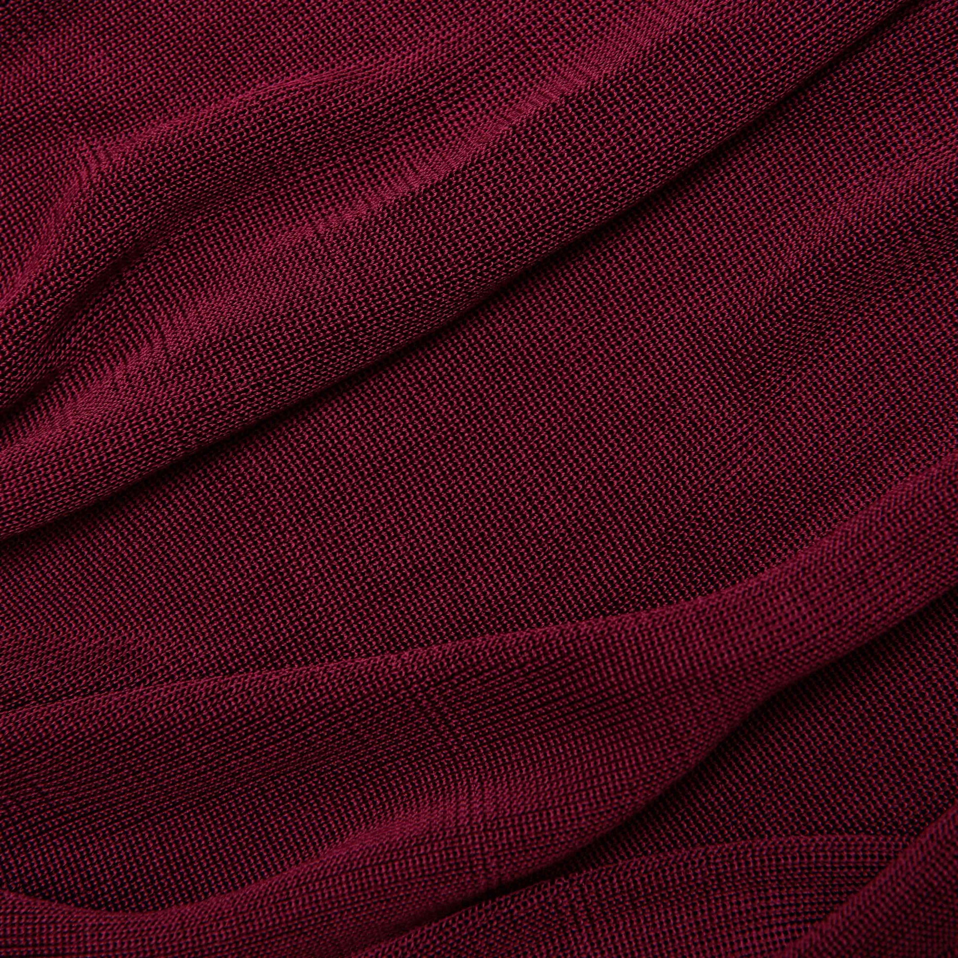 Yumuşak, şekillendirilmiş bir duruş için şarap rengi viskozadan kesilmiş bu elbisenin yüksek yakası ve vücuda oturan kesimi minimalist parti stilini güçlü bir şekilde savunuyor. İddialı küpeler ve şık bir topuz ile kombinleyin.