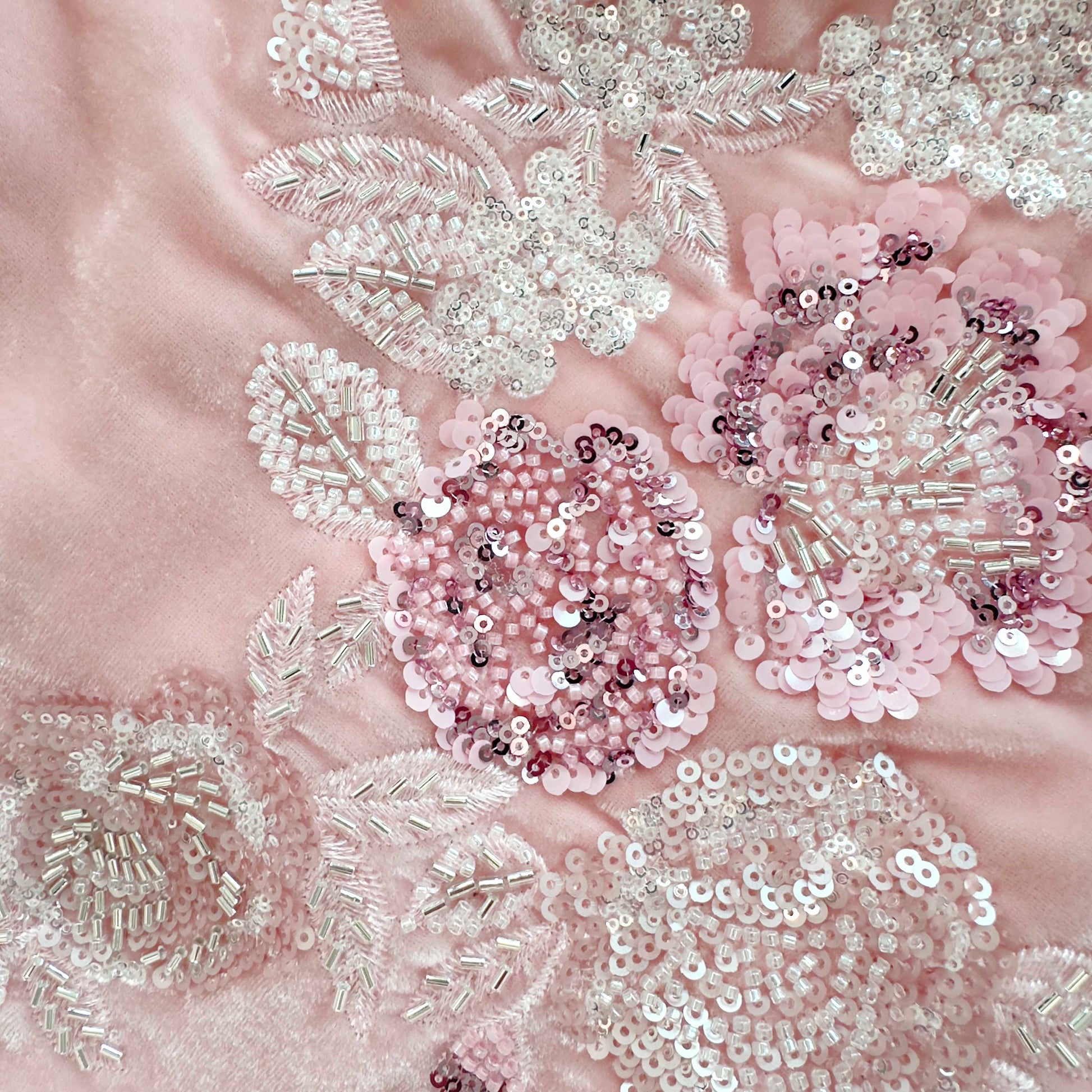 Fotoğraf dostu boncuklu velur ile tasarlanan bu maxi elbise, kayık yaka, pul işlemeli bitiş ve vücuda oturan siluetiyle Y2K ihtişamına gönderme yapıyor. Şafak vaktiye kadar dans etmek için uçuk topuklu stilettolar ekleyin.