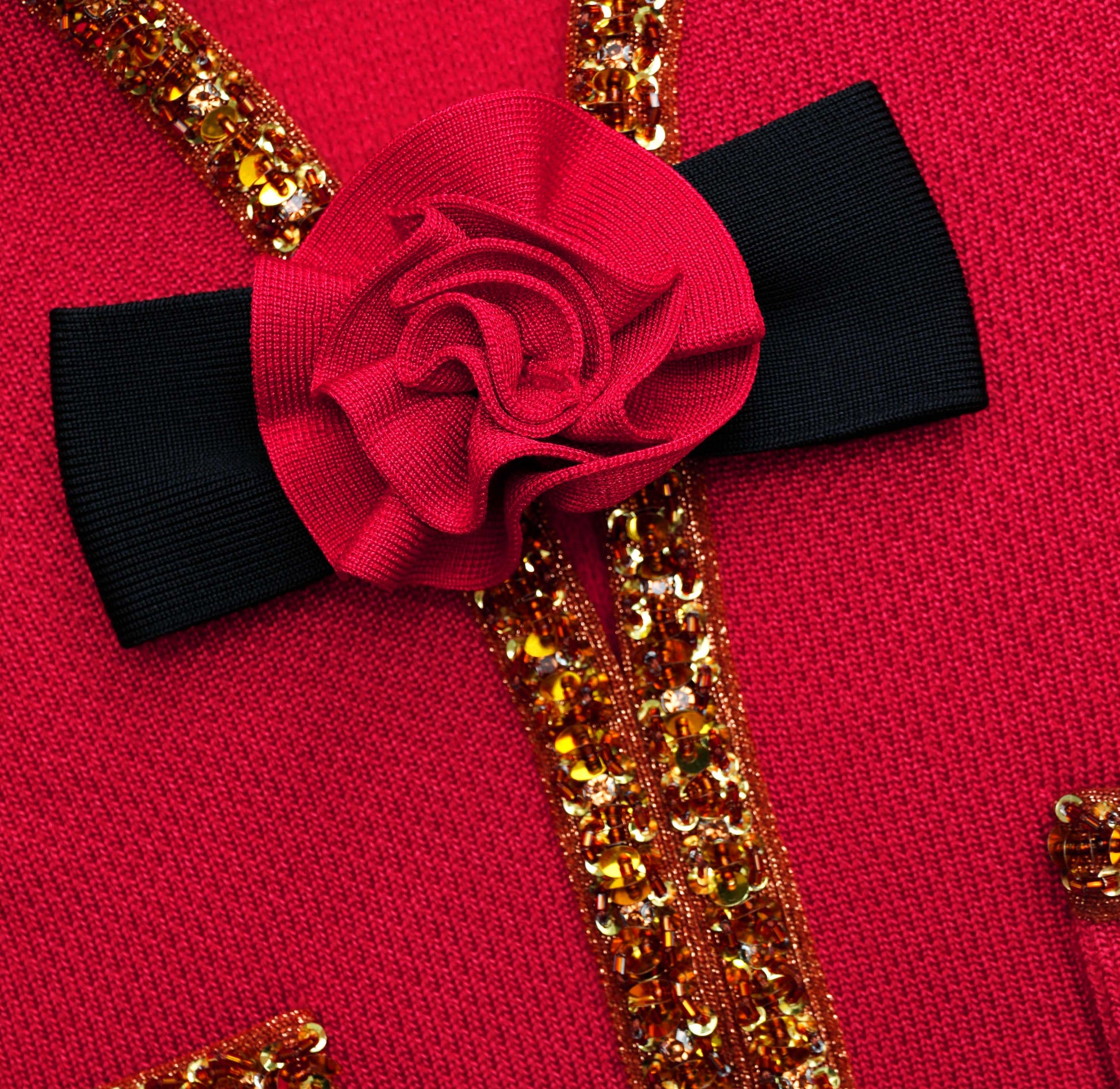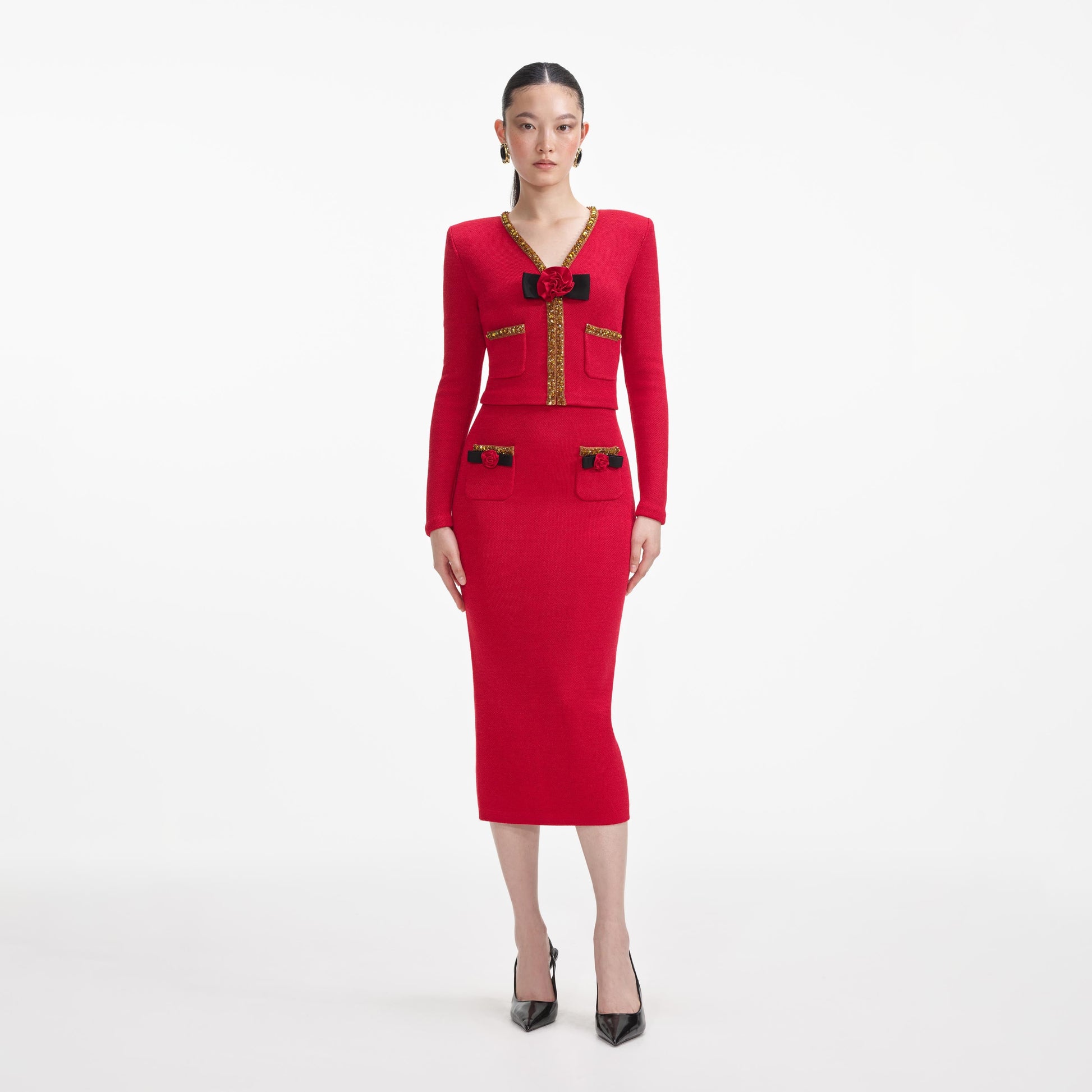 Kırmızı Dokulu Örgü Korsaj Midi Etek