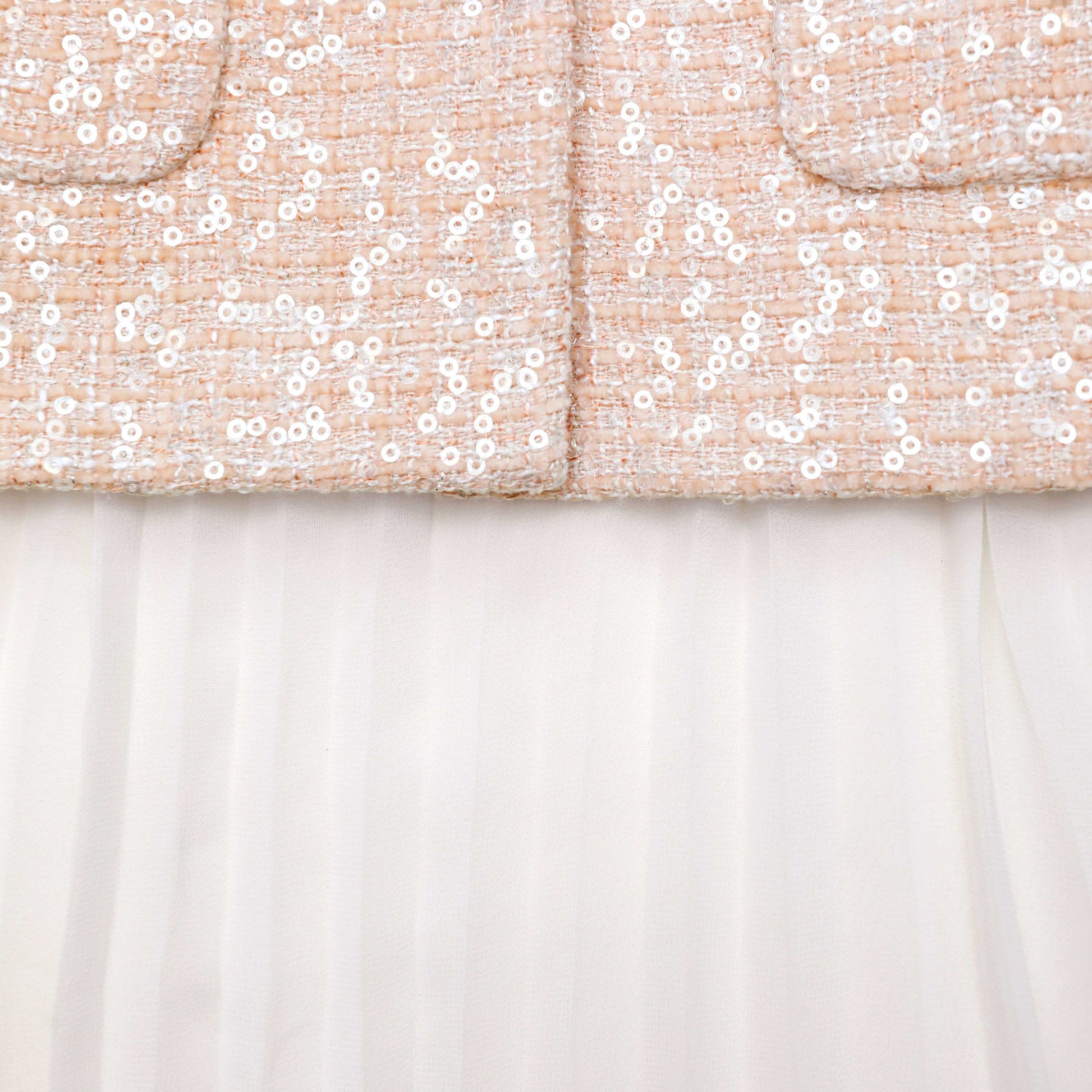 Sanatsal kontrastların bir dersi niteliğinde olan bu elbise, yumuşak yapılı simli bukle ile havadar şifon eteği birleştiriyor. Diamanté düğmelerinin ışıltısını iddialı küpelerimizle uyumlu hale getirin.