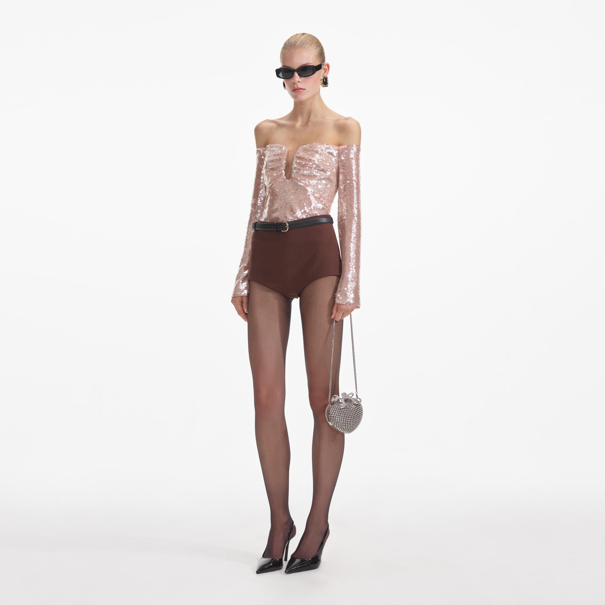 Bej pul işlemeleriyle kaplı bu üst, derin U barlı seksi omuzları açık yakasıyla yüksek parlaklık efektini vurguluyor — onu biçimli bir etek ve stilettolarla eşleştirerek dikkat çekici bir parti görünümü elde edin.
