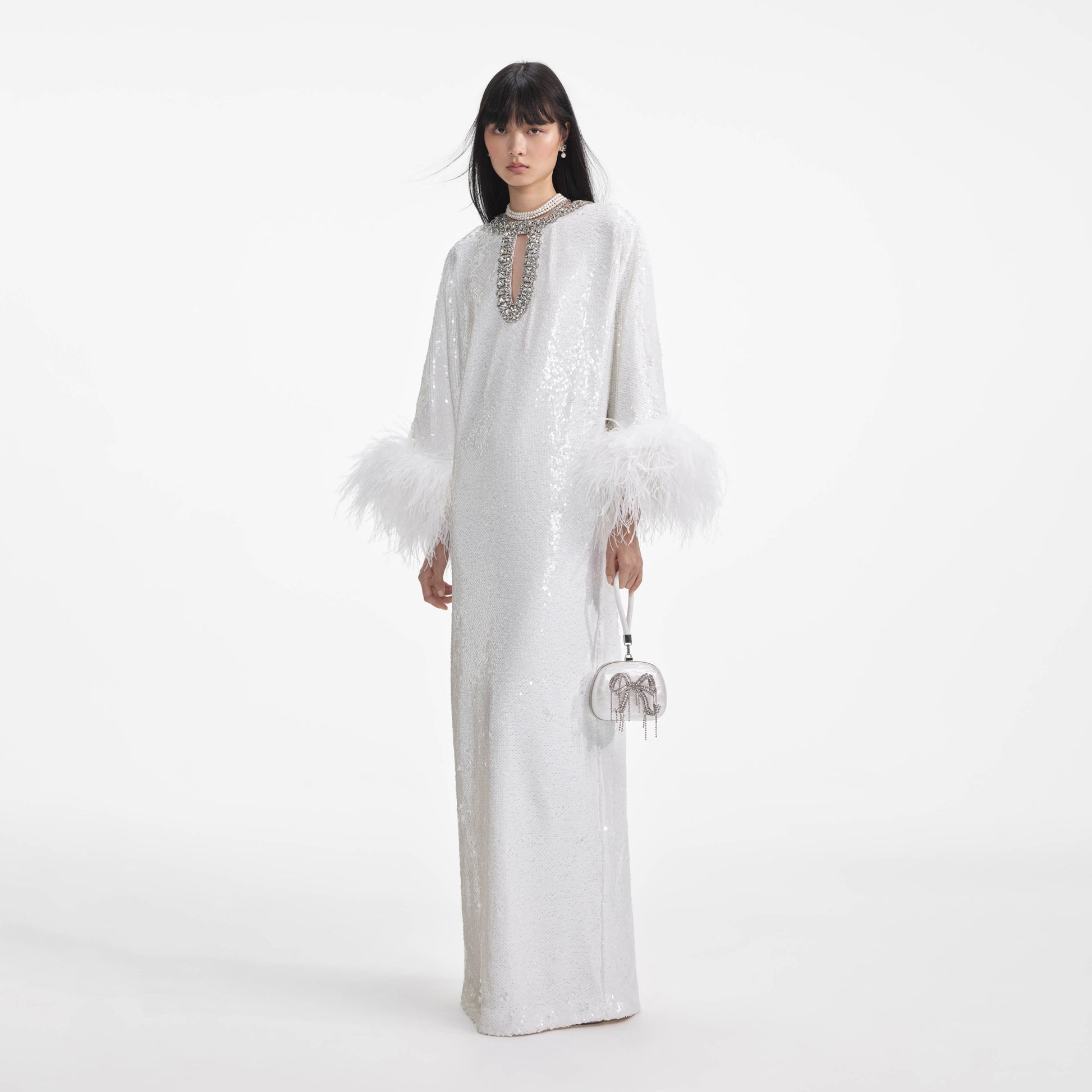 Beyaz Pullu Tüylü Uzun Elbise
