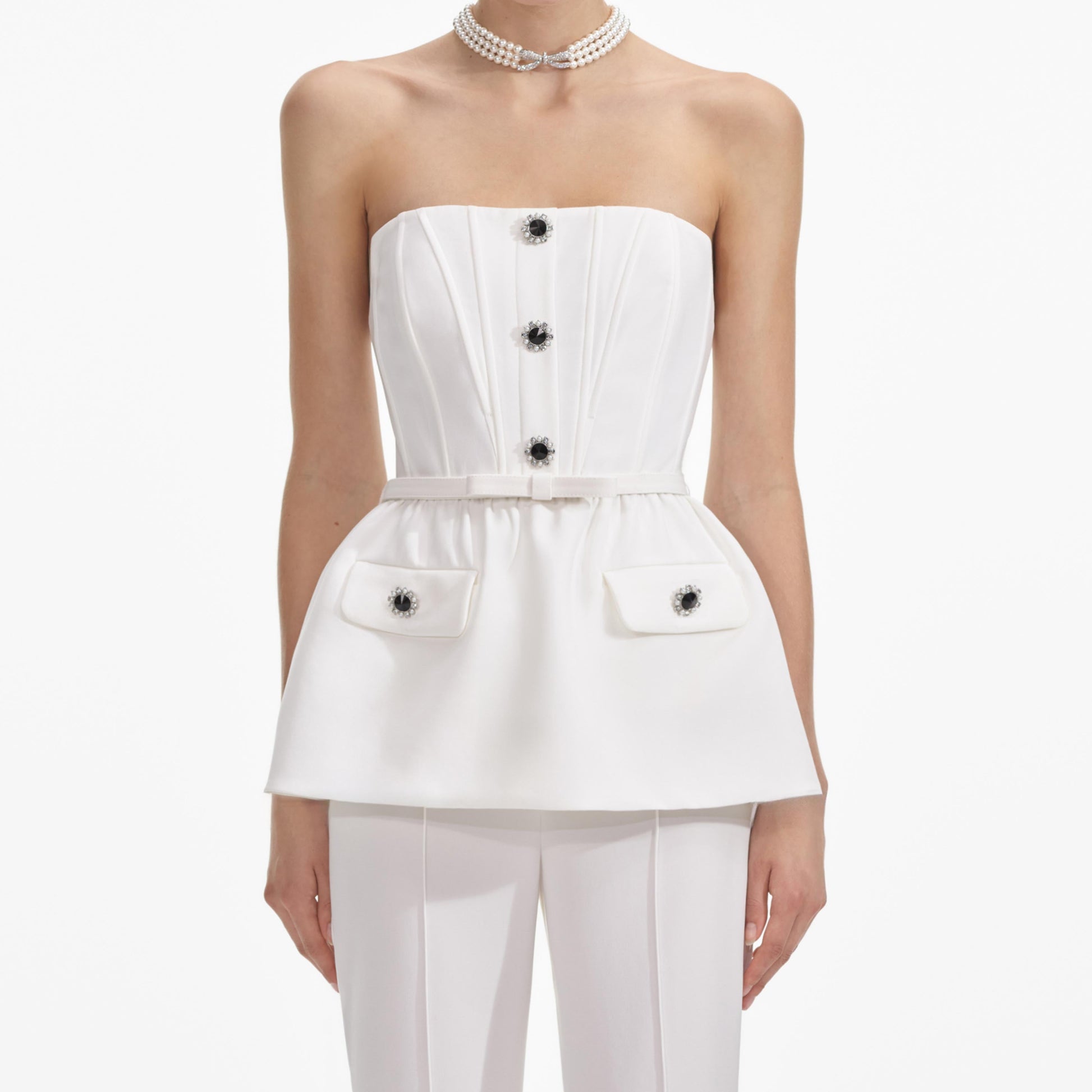 Esnek bir uyum ve yumuşak bir dokunuş için beyaz krepten kesilmiş, bu tulum doğru yerlerde beli kavrayacak ve boyunu uzatacak şekilde tasarlandı. Bantlı yakasını iddialı küpelerimizle sergileyin.